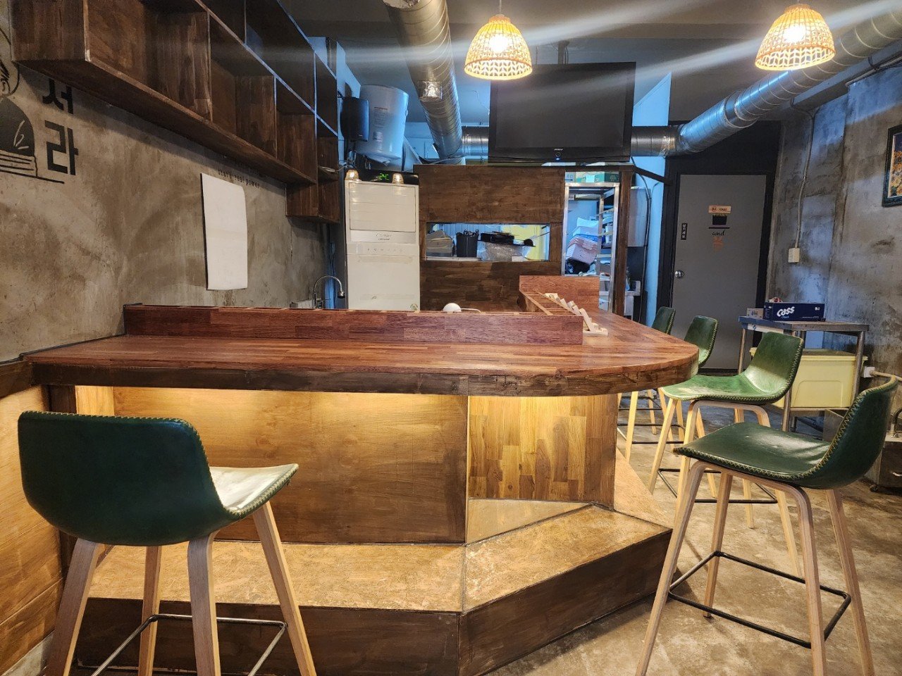 노출 목재, 손으로 다듬은 듯한 마감, 가벼운 스크래치까지 빈티지의 온기를 의도적으로 담았습니다. 과하게 새것 같은 느낌을 피하고, 요리주점 특유의 ‘머물고 싶은 친근함’을 강조했죠.
