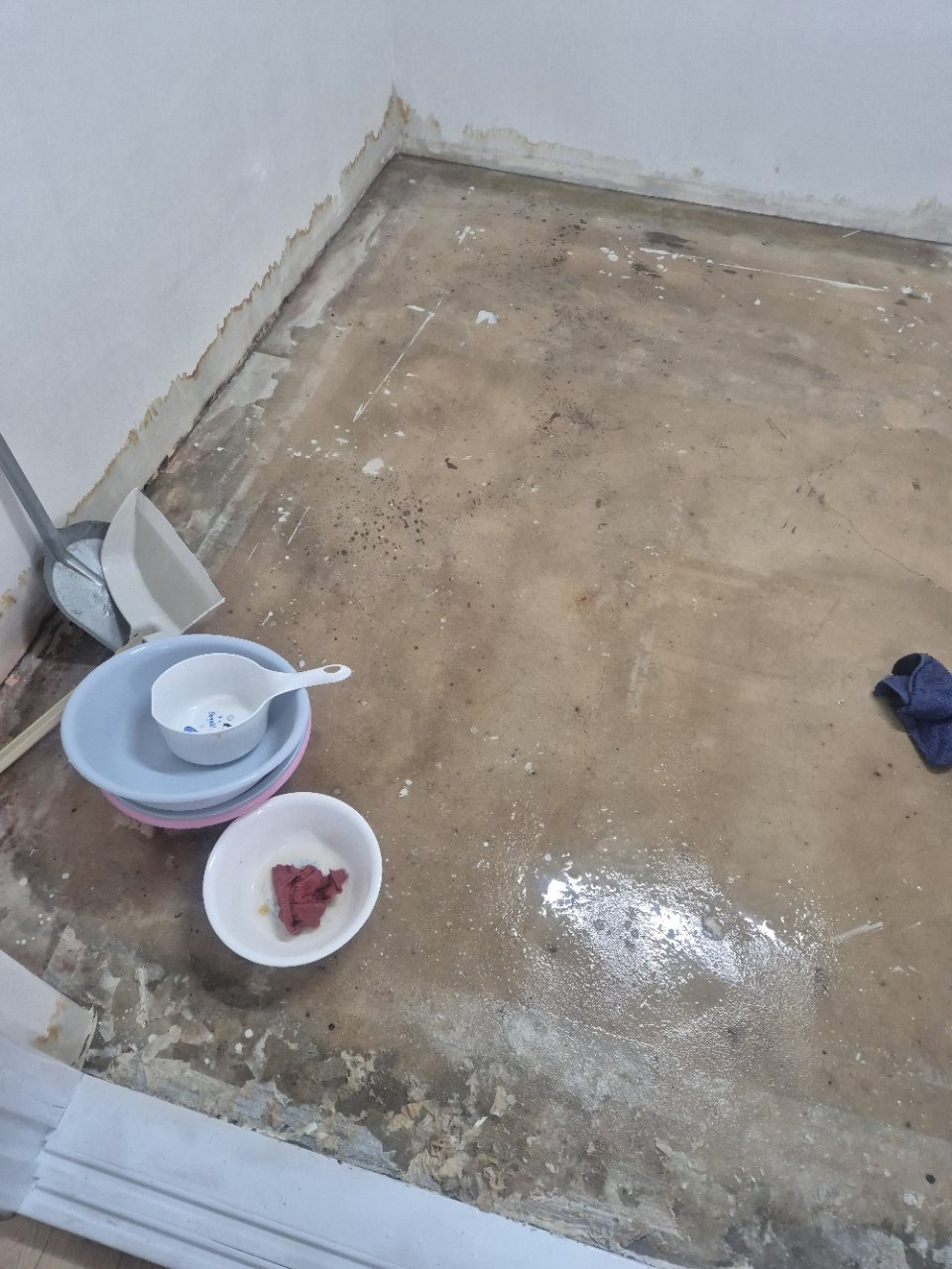 현장에 도착해 집 안 상태를 먼저 살펴보니 바닥 전역에 수분이 번져 있었고, 벽 하단부까지 물기가 스며든 자국이 이어져 있었습니다. 이렇게 넓은 범위로 침수가 진행된 경우, 어디를 기준으로 바닥을 굴착해야 할지 애매해지는 것이 가장 큰 문제입니다.