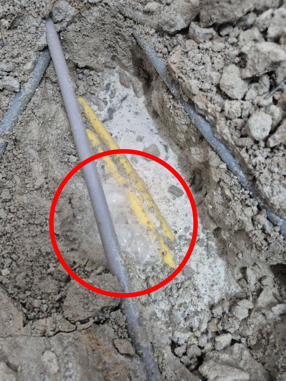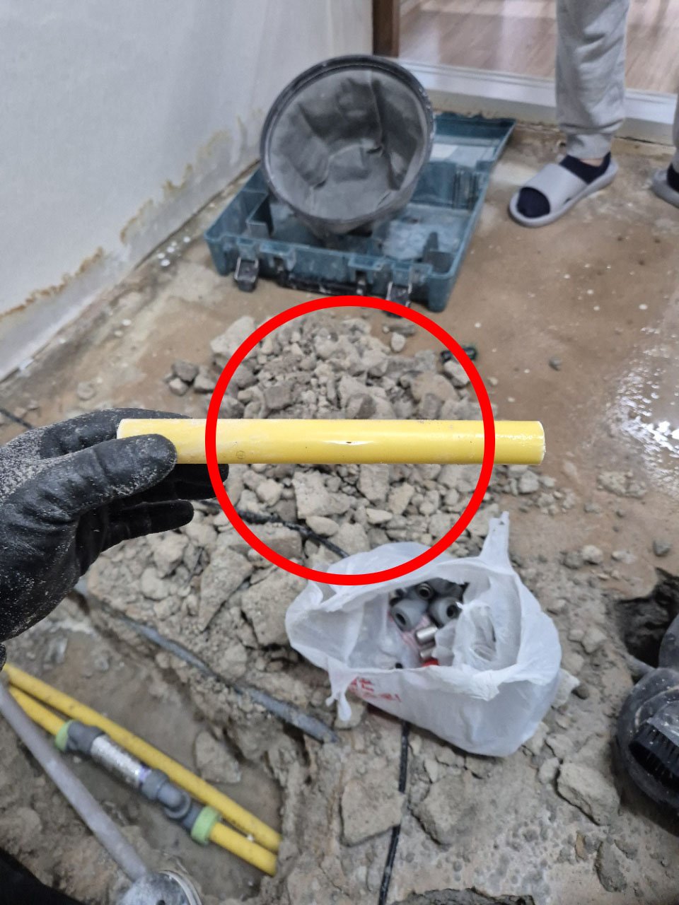 청음 결과 가장 반응이 강했던 구간을 기준으로 바닥을 굴착했습니다. 예상했던 위치에서 실제로 누수 지점이 정확하게 확인됐고, 문제가 된 온수배관을 절단 및 교체하는 방식으로 수리를 진행했습니다.