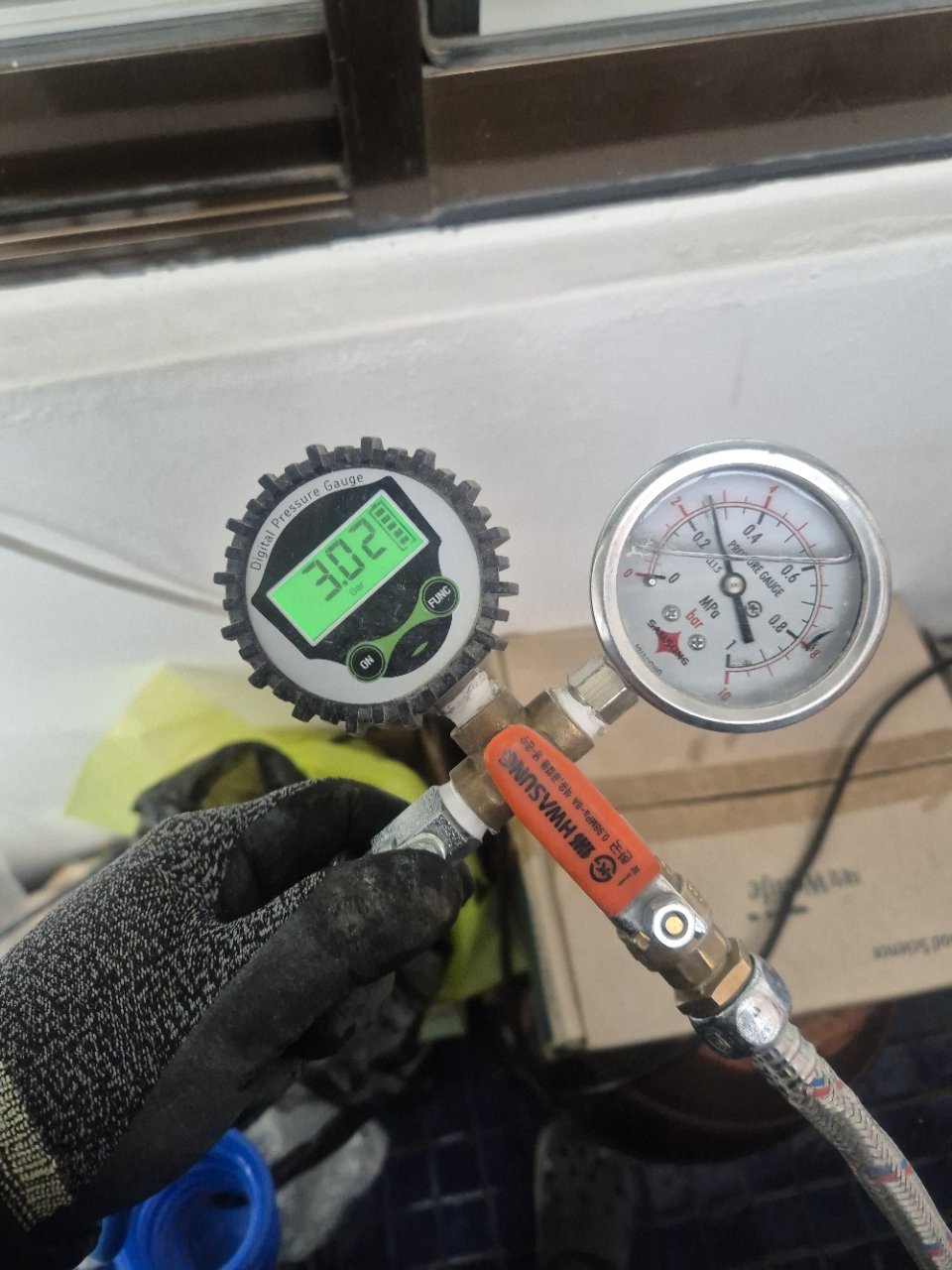 배관 보수 작업 후에는 다시 공기압을 넣어 누수 여부를 재점검했고, 더 이상 압력이 떨어지지 않는 것을 확인한 뒤 바닥에서 올라오던 물도 완전히 멈춘 것을 확인했습니다.