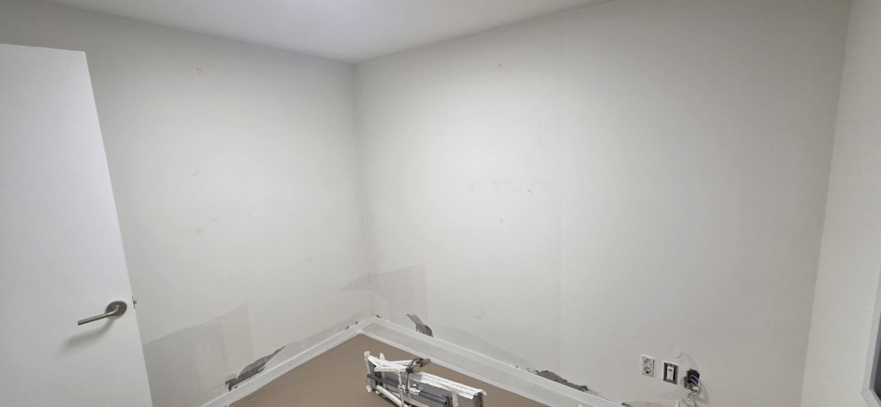 이번 집은 화이트 톤의 타일, 밝게 구성된 주방, 깔끔한 문선과 몰딩이 함께 들어가는 구조였기 때문에, 크림 계열보다는 회벽화이트가 훨씬 자연스럽게 이어질 것 같다고 설명을 드렸어요. 여러 각도에서 조명과 바닥, 문선 컬러까지 함께 보시고 최종적으로 고객님께서 회벽화이트로 결정해주셨습니다.