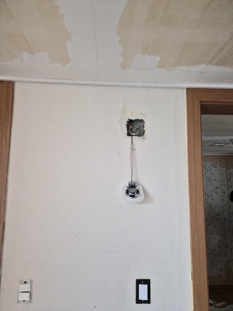 현장에 설치되어 있던 방송 스피커도 함께 매립 시공해 드렸습니다. 벽면을 최대한 깔끔하게 정리하면서 스피커가 튀지 않도록 배치하는 작업인데, 이런 부분은 도배와 동시에 잡아두면 마감선이 더욱 자연스럽게 나옵니다.