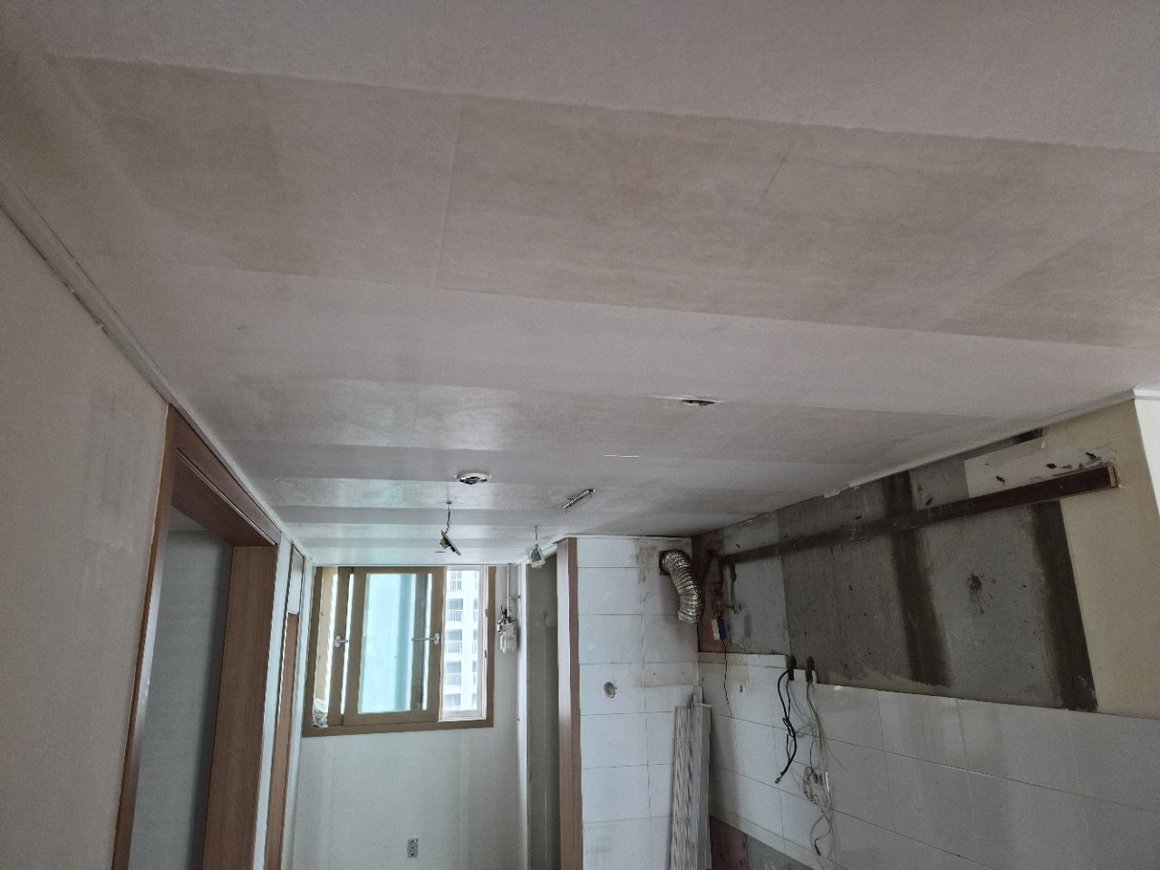 시공 전 점검에서 가장 눈에 띄었던 부분은 천장이었습니다. 예상보다 상태가 좋지 않은 편이어서 만약 그대로 정배만 진행하면 이음선이 유독 도드라져 보이거나, 도배지 표면이 군데군데 울어 보일 가능성이 컸습니다.