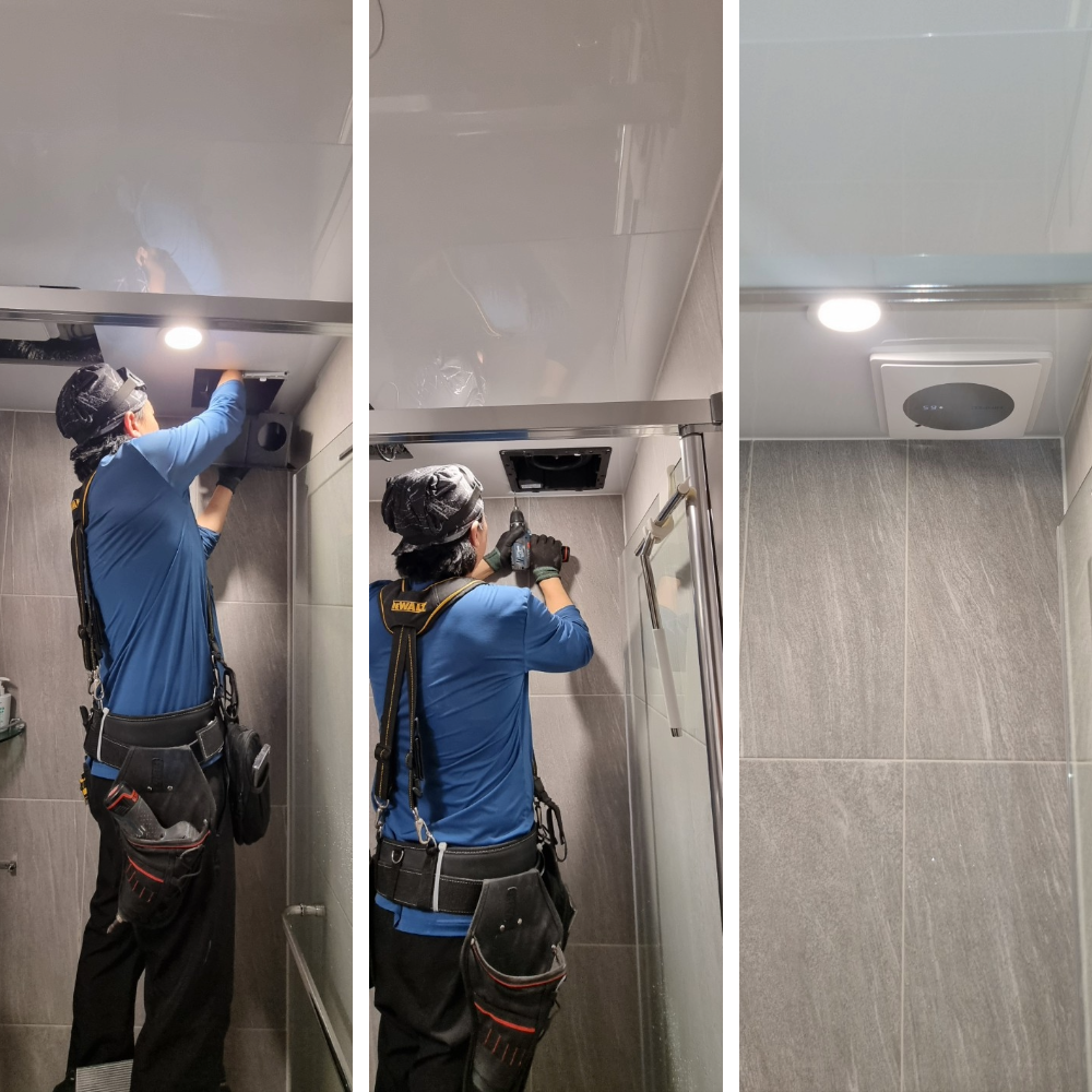 안방 화장실은 다용도실·드레스룸과 이어져 습기가 오래 머무는 편이라 풍량이 핵심이었습니다. 그래서 제로크 프라임으로 교체해 기존보다 약 1.6배 강한 바람으로 습기와 냄새를 빠르게 배출하도록 했습니다. 야간 사용을 고려해 소음과 진동을 최소화하는 방향으로 시공했습니다.