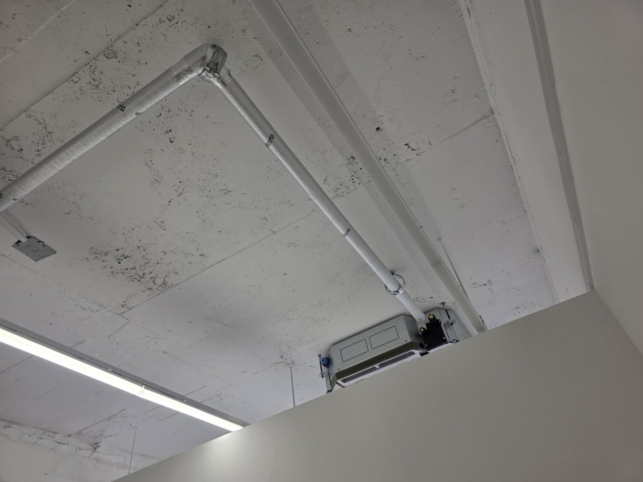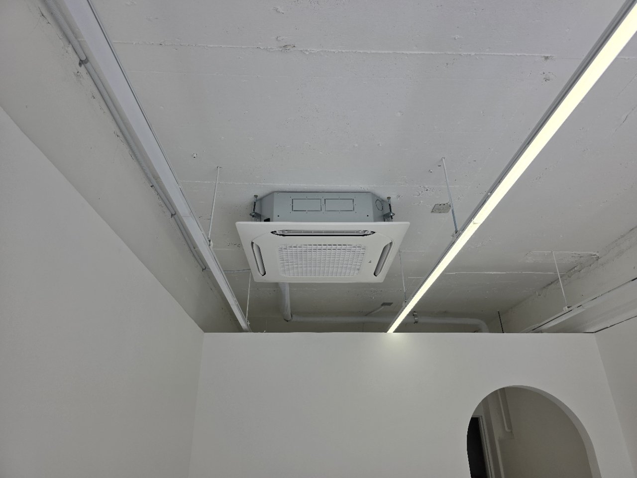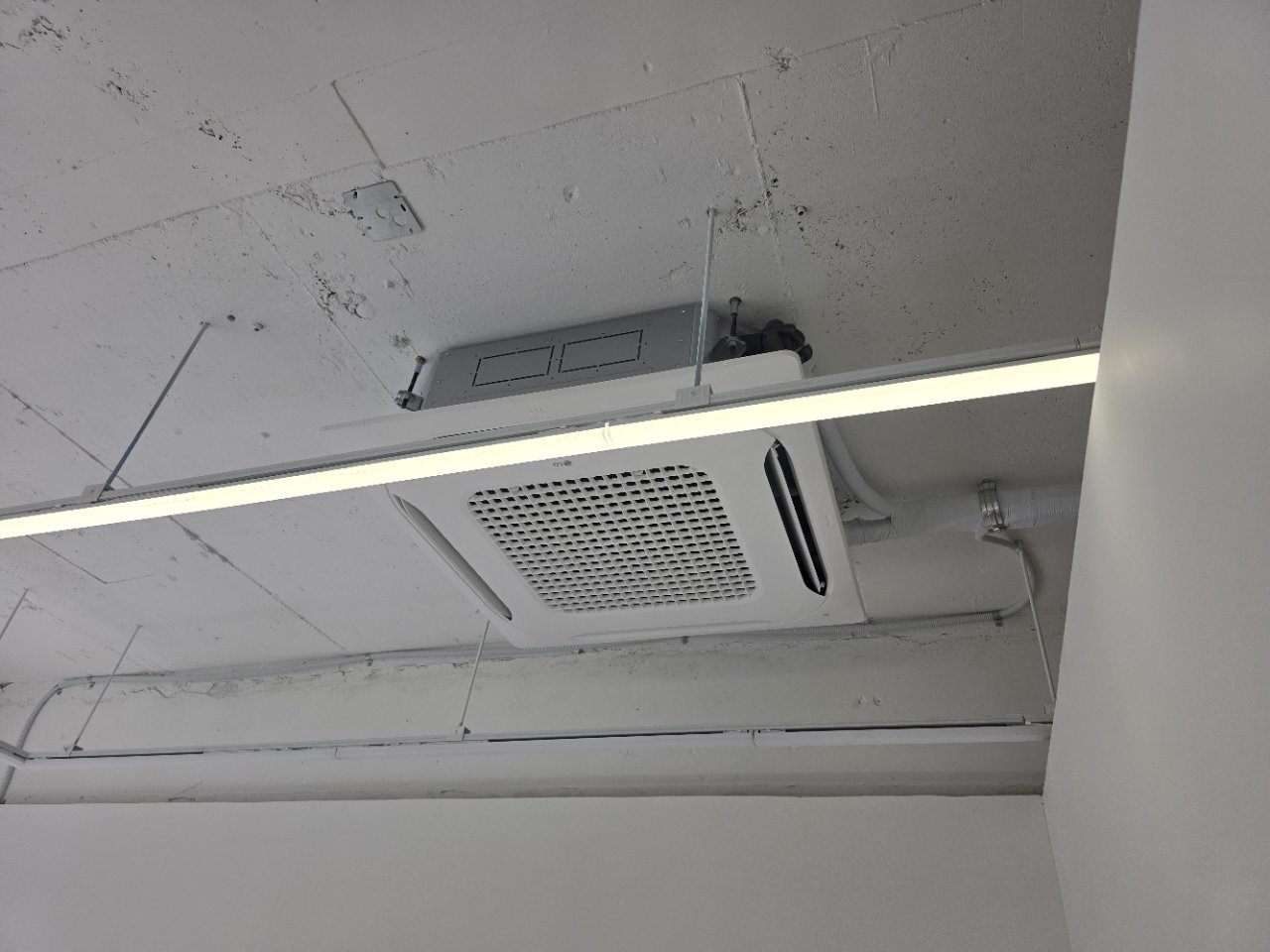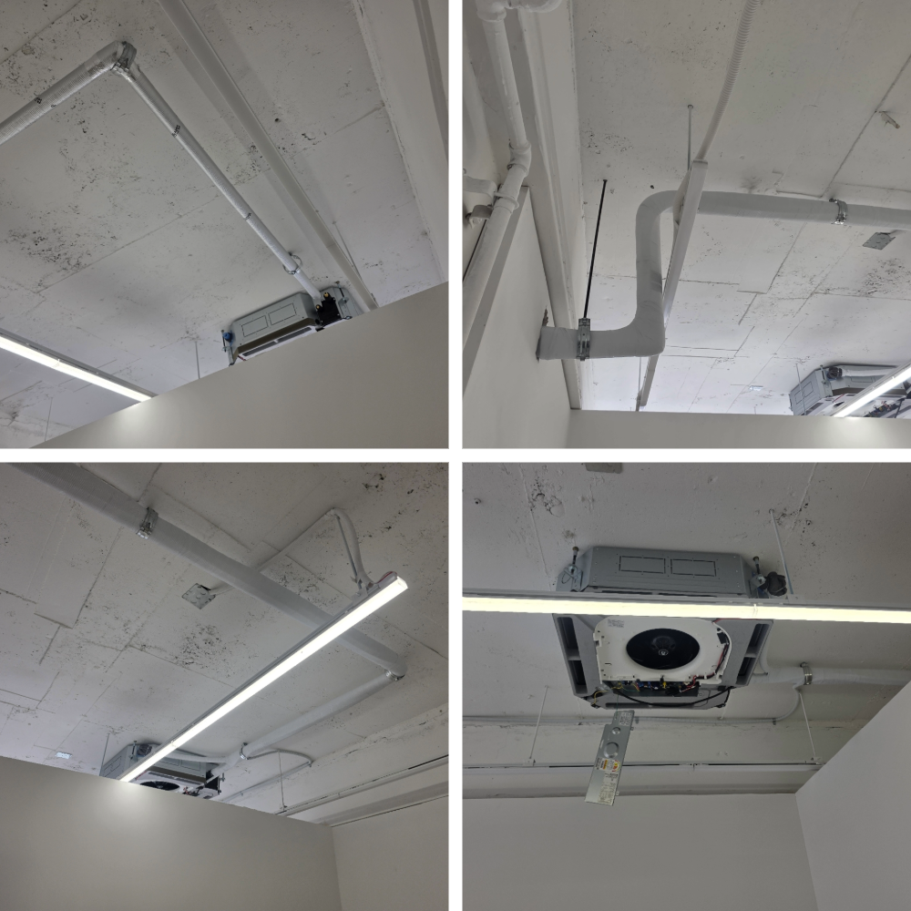 다만 천장형 냉난방기는 위치 선정이 무척 중요합니다. 중앙에서 조금만 벗어나도 바람 방향이 어색해지고, 조명이나 천장 마감과 맞지 않으면 시각적으로도 정돈되지 않은 느낌이 들 수 있습니다. 그래서 이번 현장에서는 기기 중심과 천장 구조를 함께 확인하며 가장 자연스럽고 효율적인 위치를 맞춰 설치했습니다.