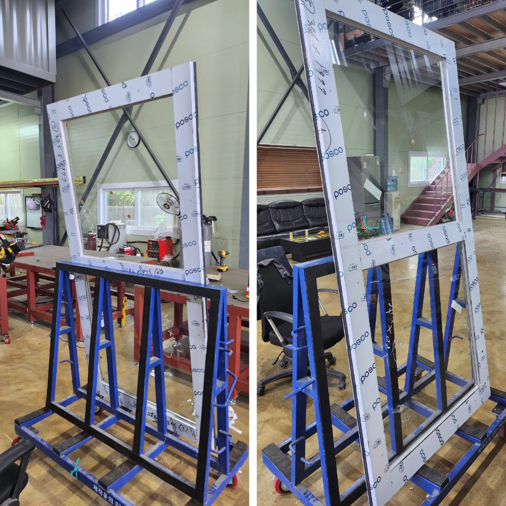 - 프레임 수평·수직 레벨링 체크 후 고정