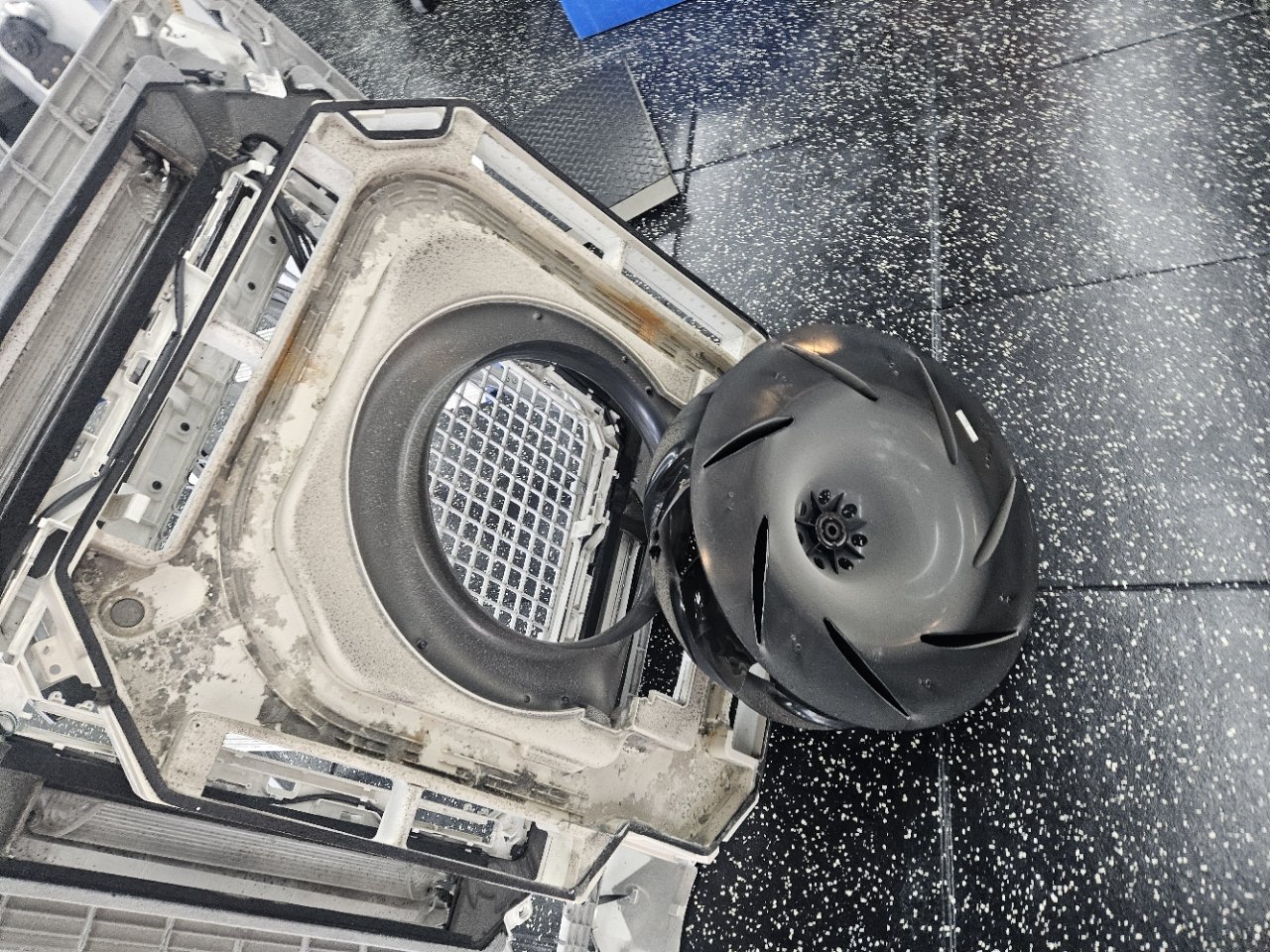 겉에서 보기에는 천장형 에어컨 패널이 깔끔해 보이더라도, 실제로 분해를 시작하면 내부 송풍팬, 드레인, 열교환기 주변에는 먼지와 생활 오염이 적지 않게 쌓여 있는 경우가 많습니다. 이번 현장 역시 외관만 보면 큰 문제가 없어 보였지만, 부품을 하나씩 분리해 보니 안쪽에 쌓여 있던 묵은 먼지와 오염이 눈에 띄는 상태였습니다.