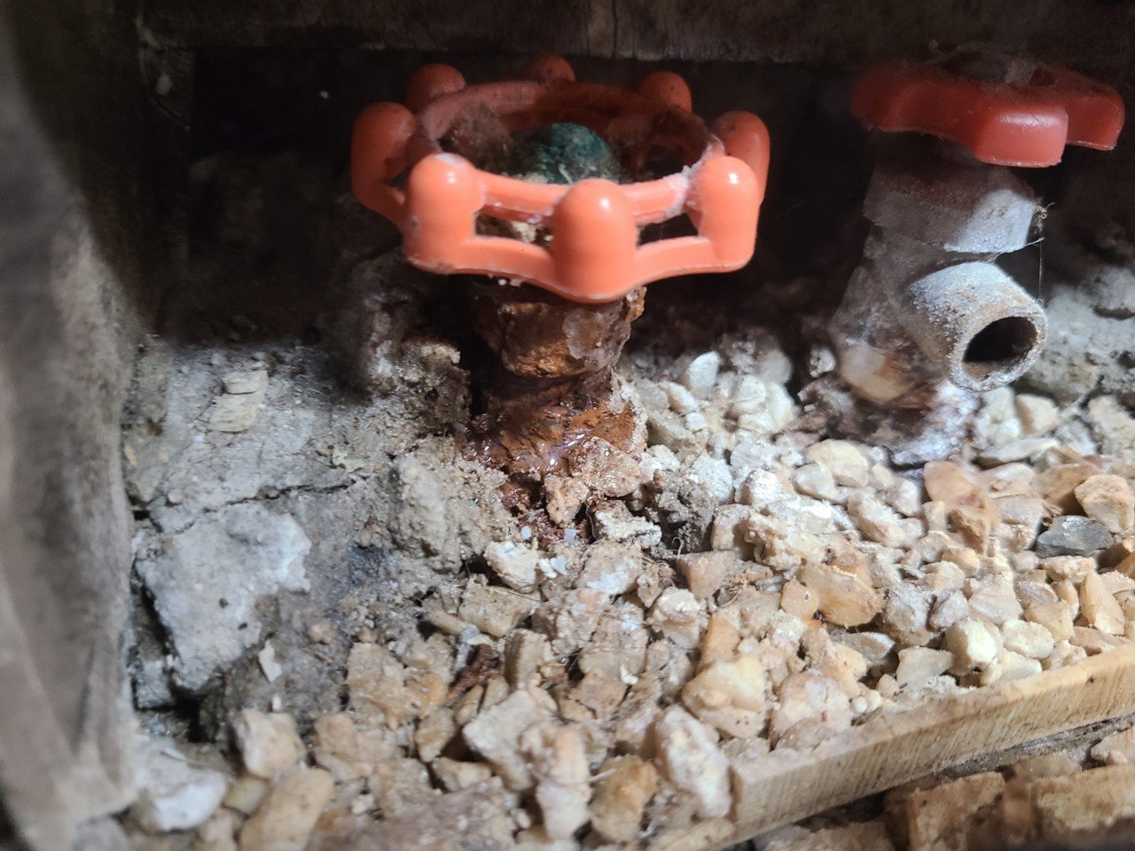 장판과 걸레받이 몰딩을 안전하게 탈거하고 벽체 하부를 개구하니 바닥 자갈층에 물이 고여 있었고, 밸브 몸체와 연결 부속 주변에는 녹과 침전물이 선명했습니다. 누수가 오래 진행됐다는 신호입니다.