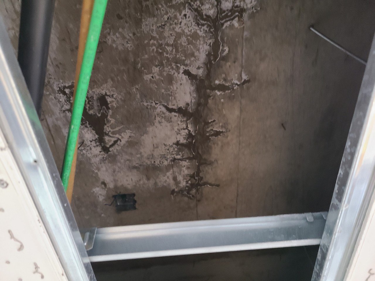 아래층 사무실 천장에서 물방울이 떨어지고 벽 하단에 변색이 번진다는 연락을 받았습니다.