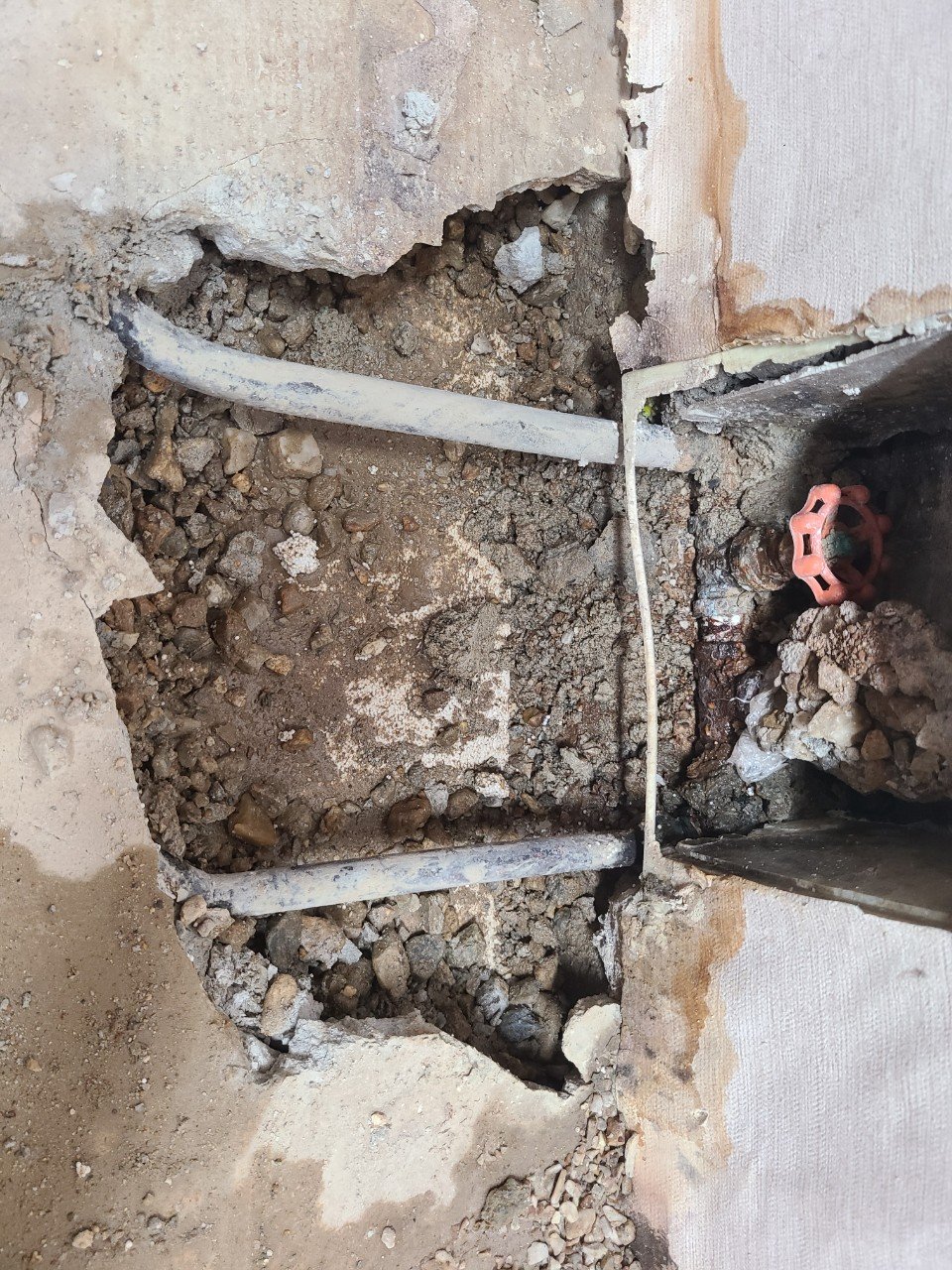 압력 테스트에서 이상 없음을 확인한 뒤, 바닥 자갈층에 고여 있던 물과 오염물을 제거하고 건조 시간을 충분히 확보했습니다. 이어 1차 미장으로 마감 복구를 진행했습니다.