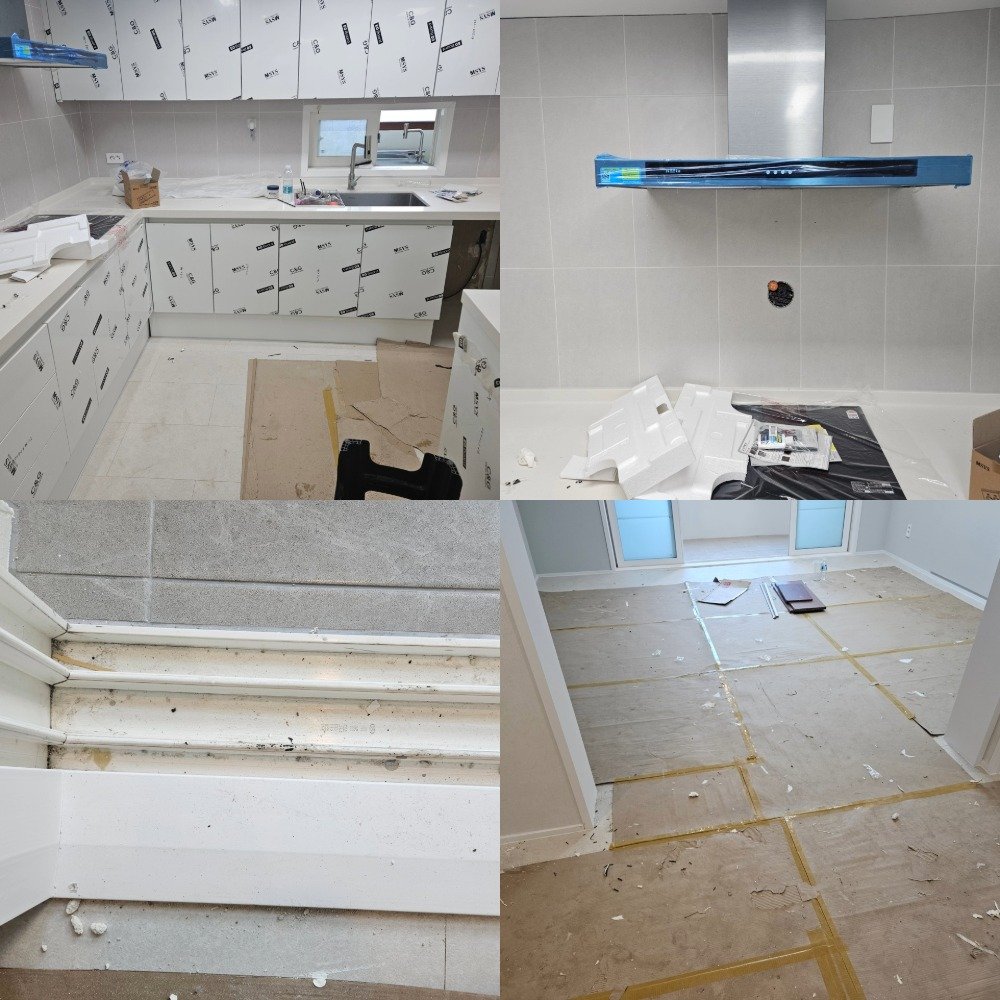 도착 직후 집 안 곳곳에 공사먼지와 분진이 남아 있었고, 창틀·몰딩·벽면에는 실리콘 자국이 보였습니다. 새로 도배한 벽지와 아트월에는 도배풀 자국, 강마루와 포세린 타일 바닥에는 보양 흔적이 그대로. 새 가전과 가구에 부착된 보양필름도 많이 남아 있어 하나씩 제거하는 것부터 시작했어요.