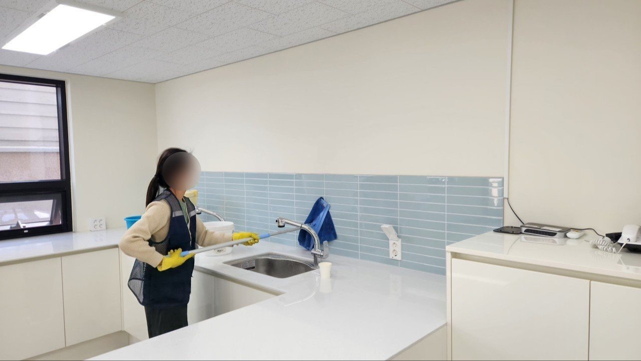 탕비공간에는 화이트 상판과 싱크대, 수전, 벽면 타일이 시공되어 있었습니다. 이런 마감재는 조금만 먼지가 남아도 바로 눈에 들어오기 때문에, 마무리 단계에서 특히 신경을 많이 쓰는 구역입니다.