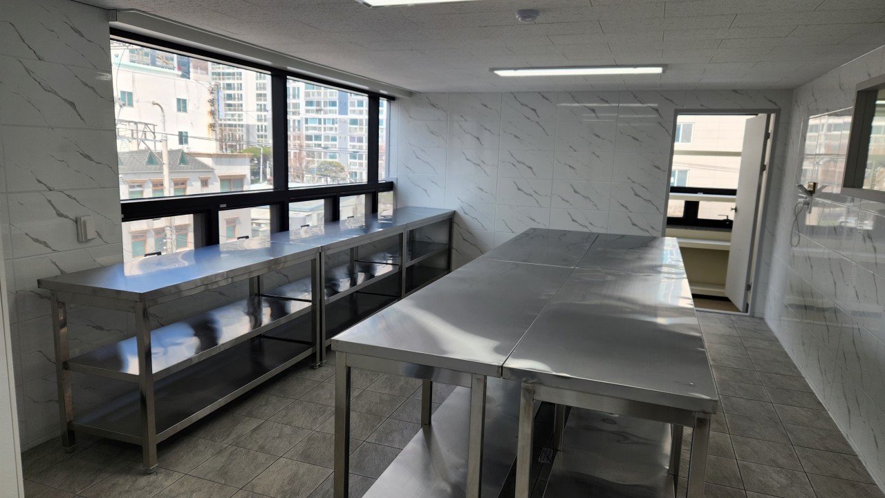 주방으로 사용할 공간에는 긴 스테인리스 작업대가 설치되어 있었습니다. 이 소재는 작은 자국이나 얼룩도 그대로 드러나는 편이라, 표면 정리가 중요합니다.