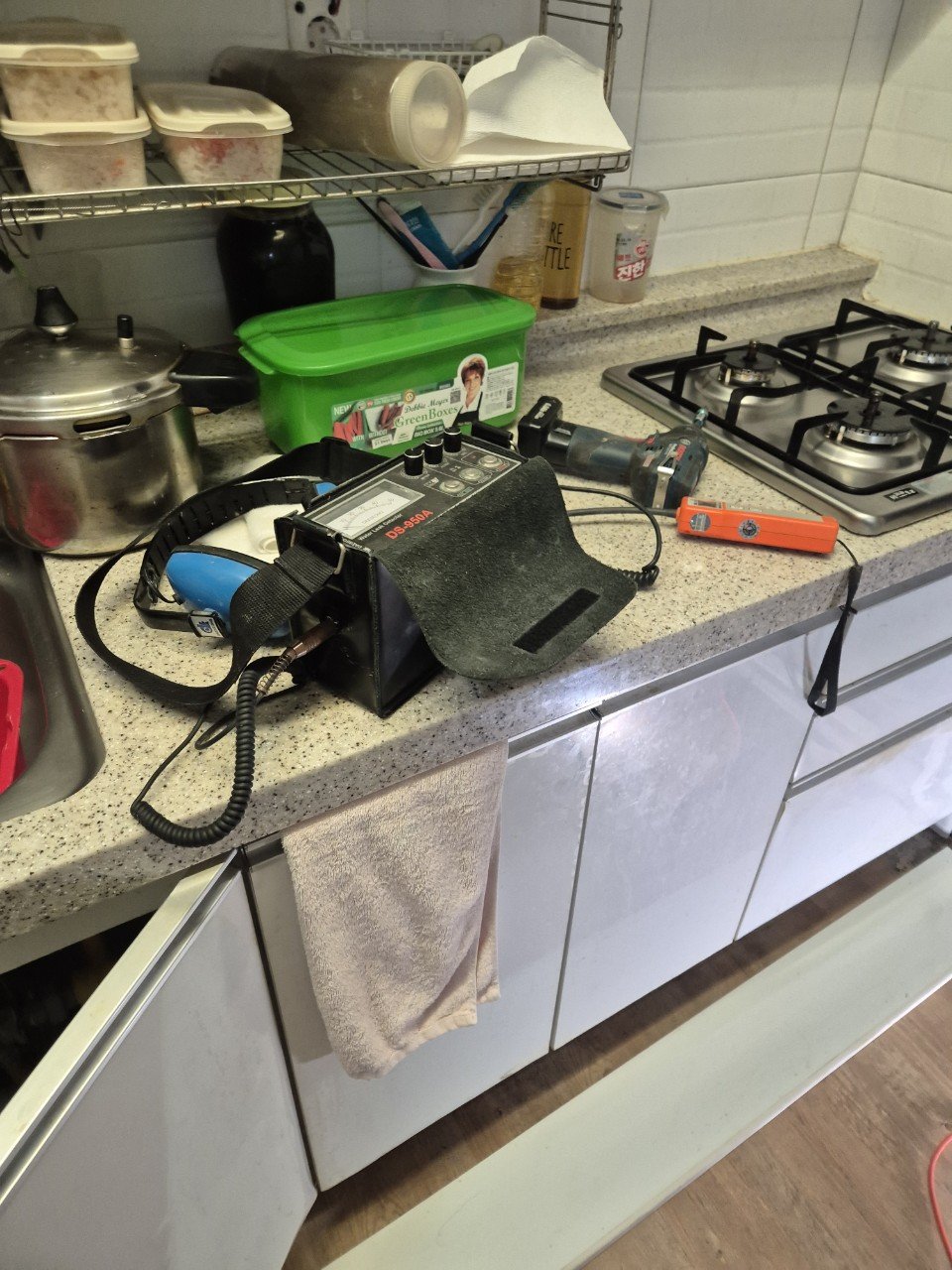 이번 대연동 아파트 현장에서도 먼저 누수탐지 장비를 세팅하고, 주방 주변 배관이 지나가는 동선을 차근차근 확인했습니다. 벽체와 바닥에서 들려오는 소리의 변화, 장비 반응, 수압 변동 등을 하나씩 대조하면서 누수가 의심되는 구간을 좁혀 갔습니다.