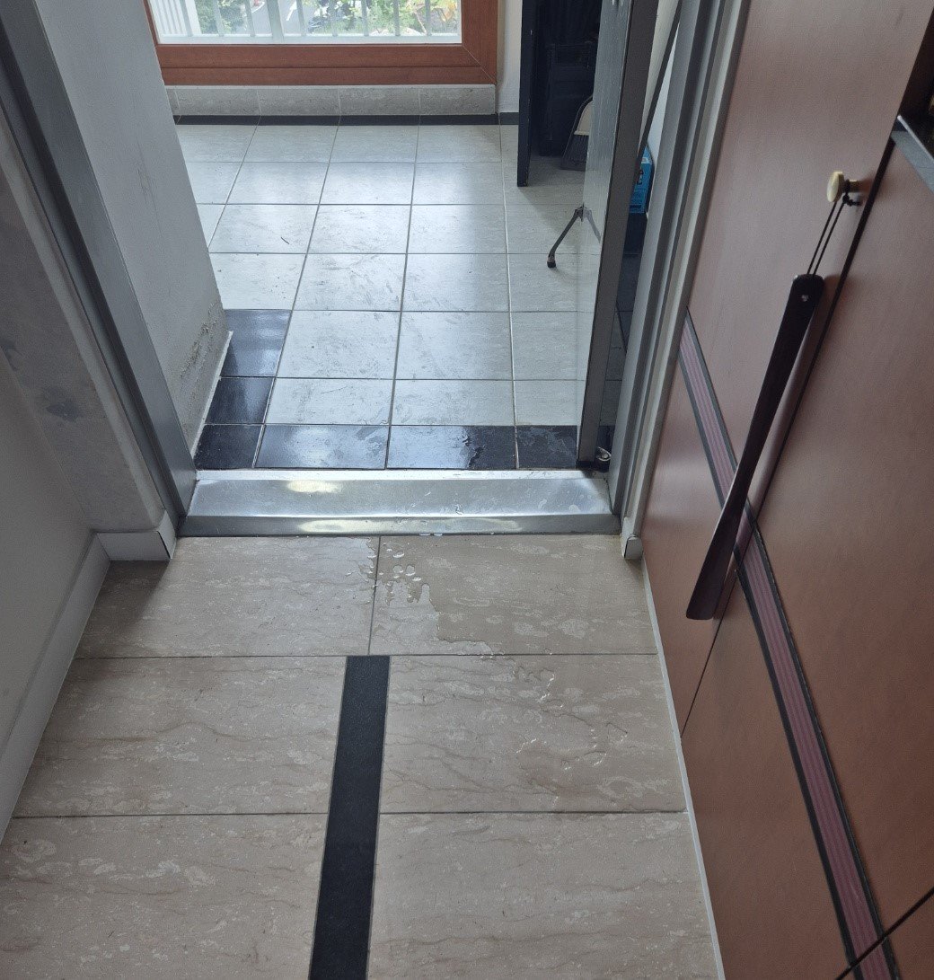 - 증상: 현관 바닥 지속적 습기 및 미끄러움