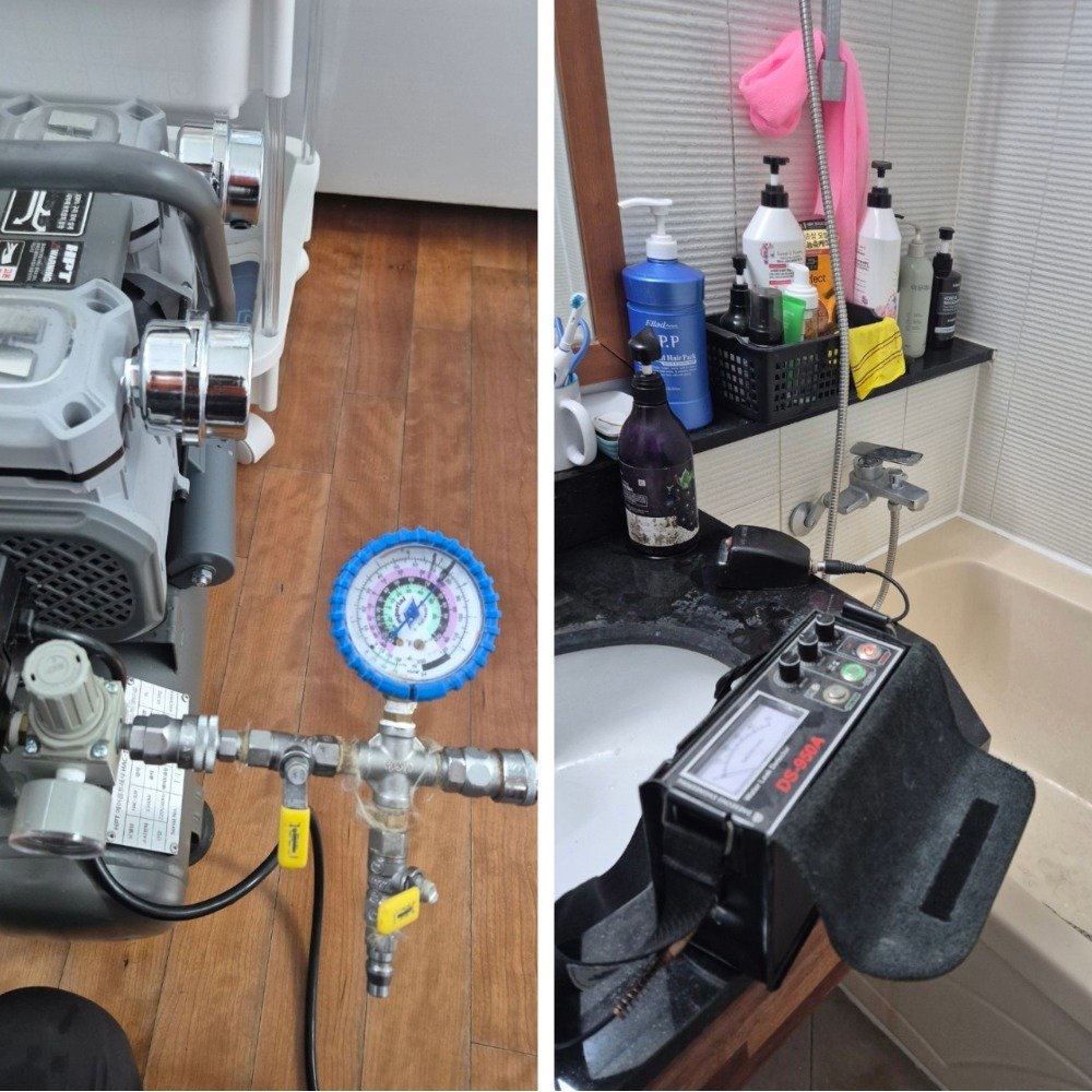 이어서 수도 라인의 가능성을 열어두고 메인 밸브를 잠근 뒤 배관 내 잔수를 빼고, 공기압을 주입해 구간별로 소음을 청음하는 방식으로 탐지를 진행했습니다. 눈에 보이는 물자국이 없어도, 소리와 압력 변화로 미세한 누수를 좁혀가는 작업입니다.