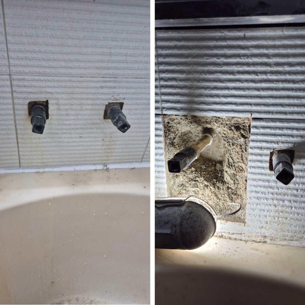 공기압 테스트를 진행하며 구간을 하나씩 배제한 끝에, 화장실 샤워기 연결 부속(혼합수전 연결부) 안쪽 깊은 지점에서 미세누수가 확인됐습니다. 틈이 매우 작아 외관상 전혀 드러나지 않았고, 일반 점검으로는 놓치기 쉬운 수준이었습니다.