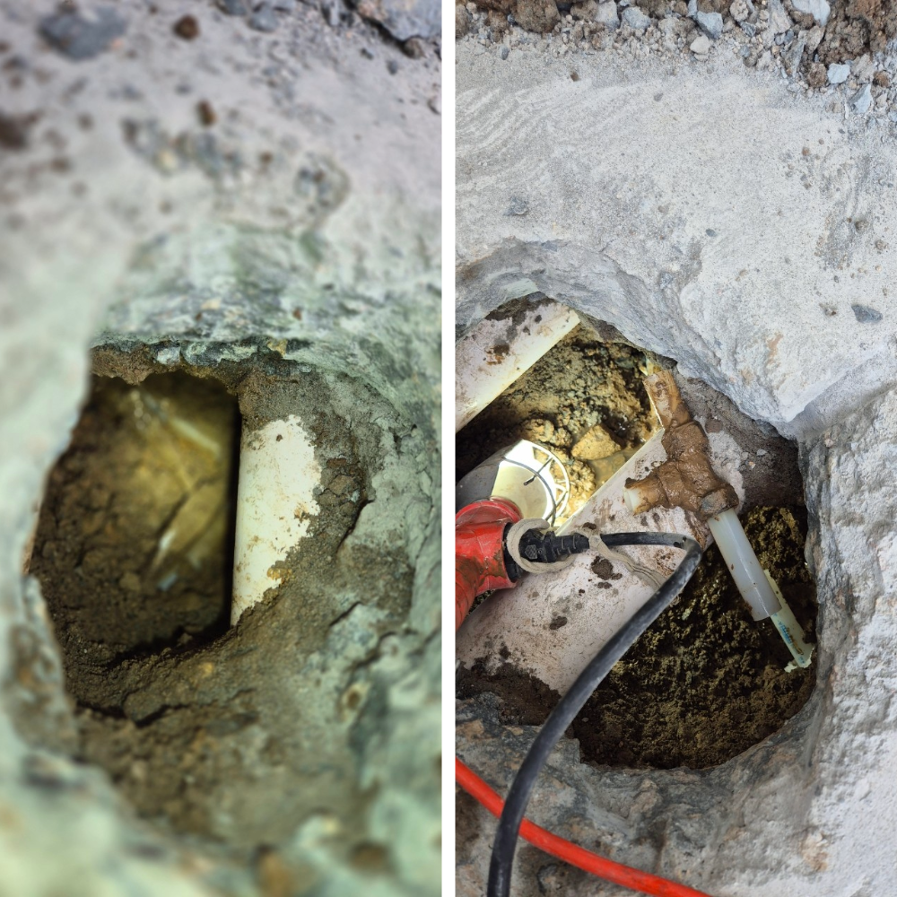 누수 지점을 좁히기 위해 청음탐지기를 이용해 배관 흐름음을 추적했습니다. 소리가 가장 또렷하게 집중되는 지점을 중심으로 바닥을 절개했더니, 오래된 배관 연결 부속에서 미세한 누수가 발생하는 것을 확인했습니다. 이음부가 노후로 약해지면서 틈이 생긴 상태였어요.
