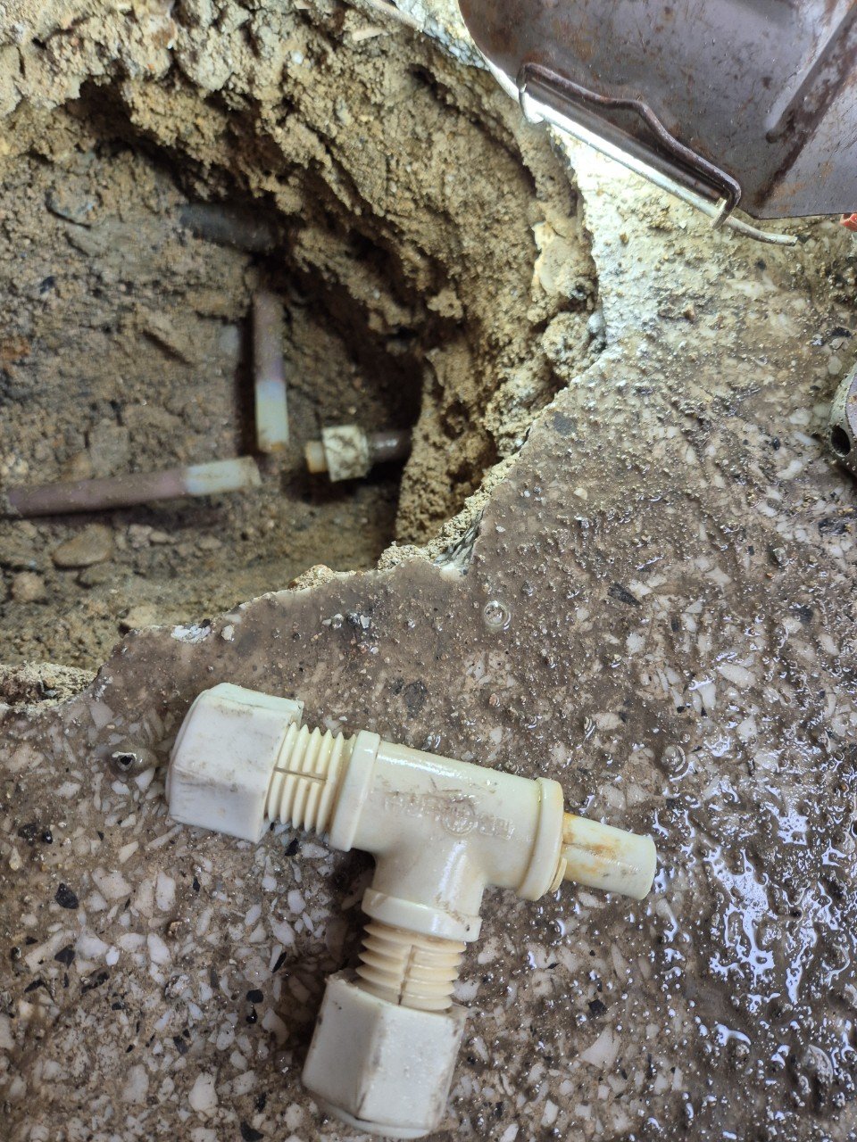 노출된 연결부는 플라스틱 커넥터가 노후로 금이 간 상태였습니다. 틈 사이로 물이 지속적으로 샜고, 그 물이 바닥 슬래브 하부로 빠지며 외부에 드러나지 않는 전형적인 직수관 누수 형태였습니다.