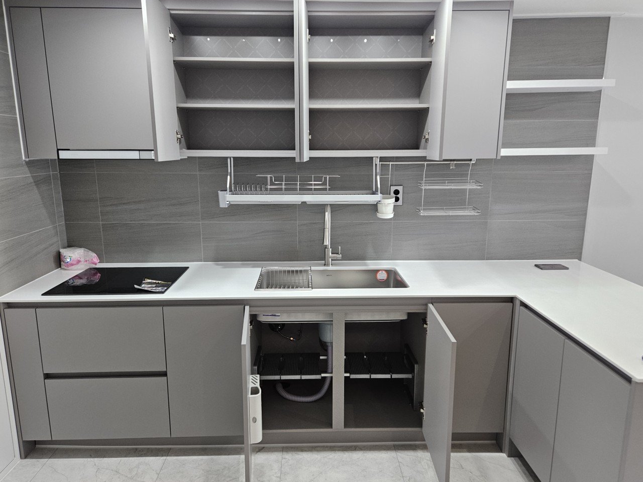 - 주방: 싱크대 서랍과 수납장을 모두 비우고 내부 먼지와 얼룩을 전용 세제로 닦아냈습니다. 하부 공간과 배수구 주변의 유분·자재가루까지 꼼꼼히 정리해 바로 식기 수납이 가능하도록 준비했어요.