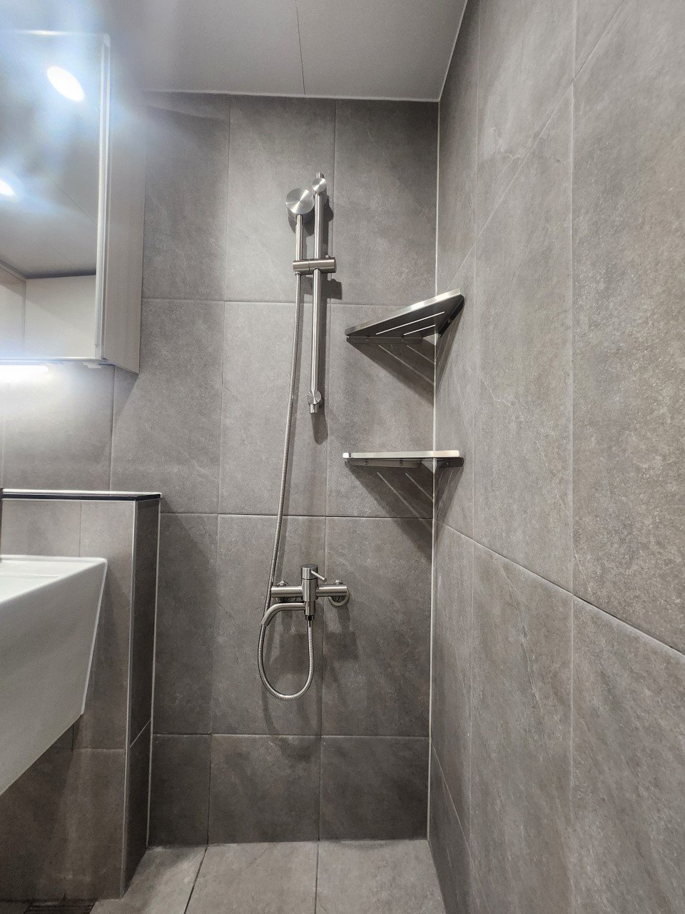 샤워존에는 선반과 수전 위치를 실제 사용 높이에 맞춰 조정해 물때가 쉽게 끼지 않도록 구성했습니다. 물 흐름과 동선을 미리 계산해두면, 사용 후 물이 고이는 부분이 줄어 관리가 훨씬 수월해집니다.