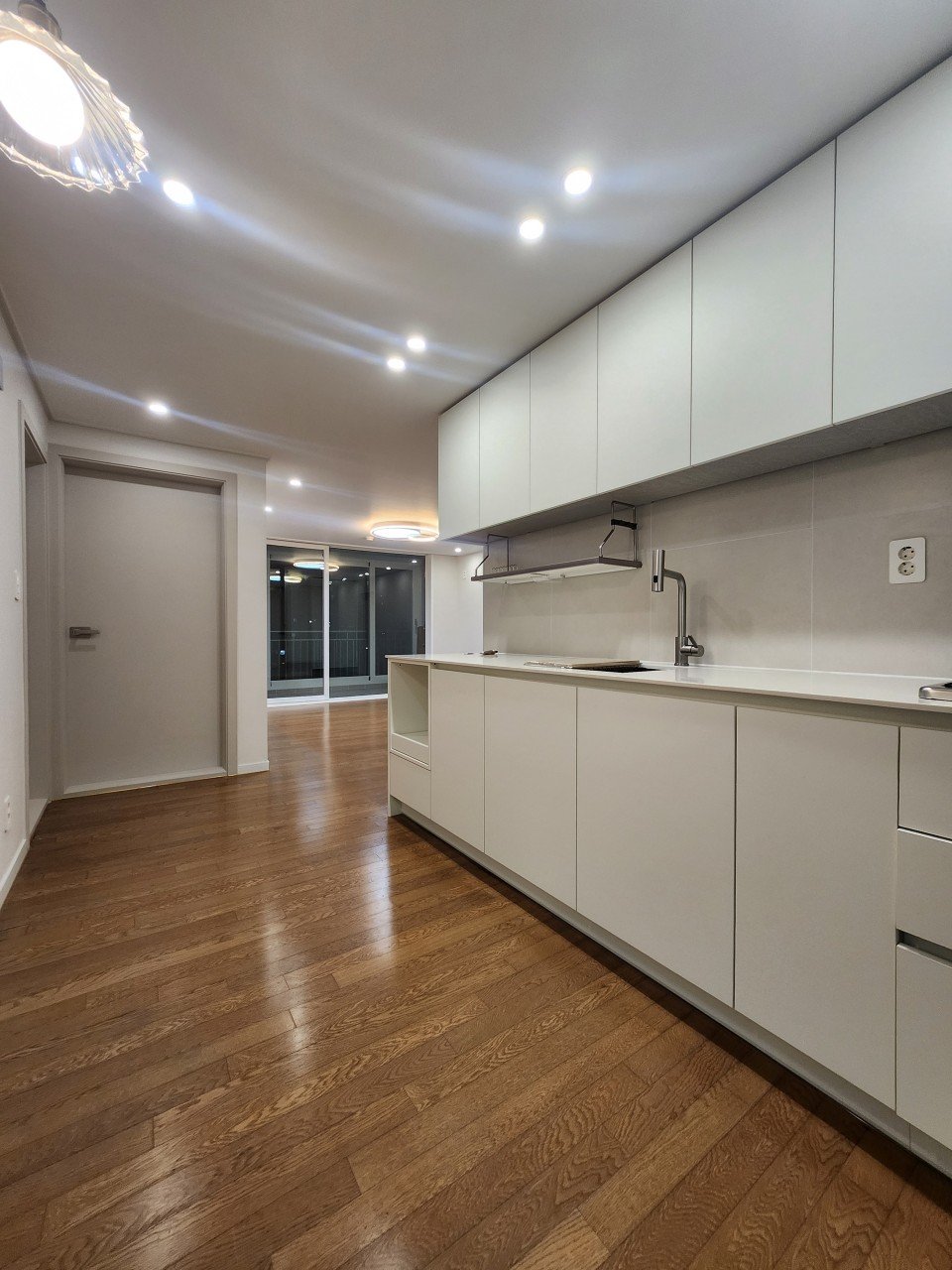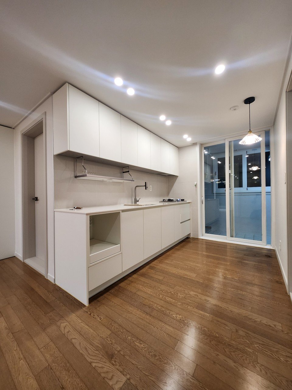 화이트 톤의 매끈한 플랫 도어를 사용해 시선이 군더더기 없이 정리되도록 했고, 상부장과 하부장 라인이 길게 이어지도록 구성해 공간이 잘게 나눠져 보이지 않게 설계했습니다. 이렇게 라인을 길게 잡아주면 24평형처럼 비교적 아담한 평수에서도 주방이 훨씬 시원해 보입니다.