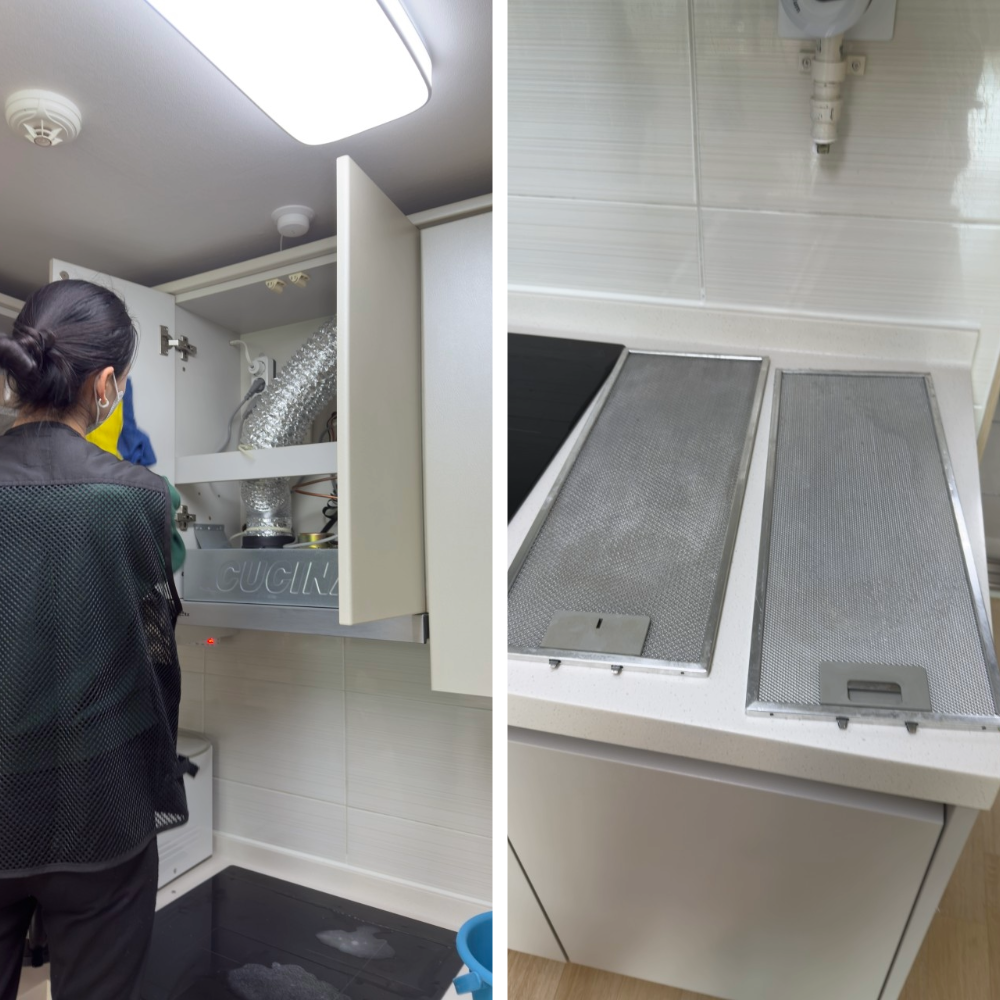 후드 부분은 필터를 분리해 세척 준비를 해두고, 기름때와 먼지가 충분히 불려질 수 있도록 불림 과정을 거친 뒤 헹굼과 건조까지 진행했습니다. 후드 필터는 오염이 쌓이면 냄새나 환기 효율에도 영향을 줄 수 있기 때문에 시간이 조금 더 걸리더라도 꼼꼼히 관리하는 편입니다.