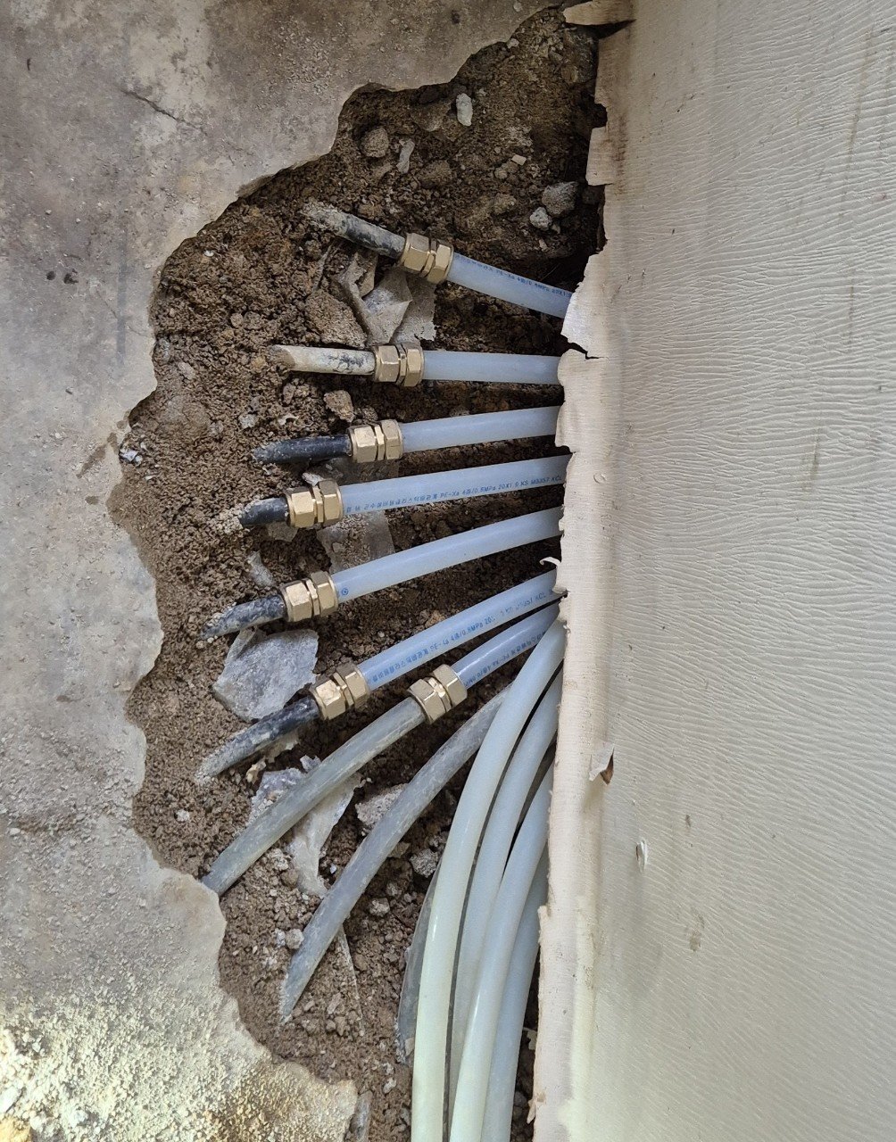 불필요하게 넓은 범위를 철거하지 않도록 작업 범위를 최소화하여 분배기 교체를 진행했습니다. 기존 분배기를 철거한 뒤, 새 분배기를 설치하고 각 난방 라인 연결부를 새 자재로 다시 정리했습니다.