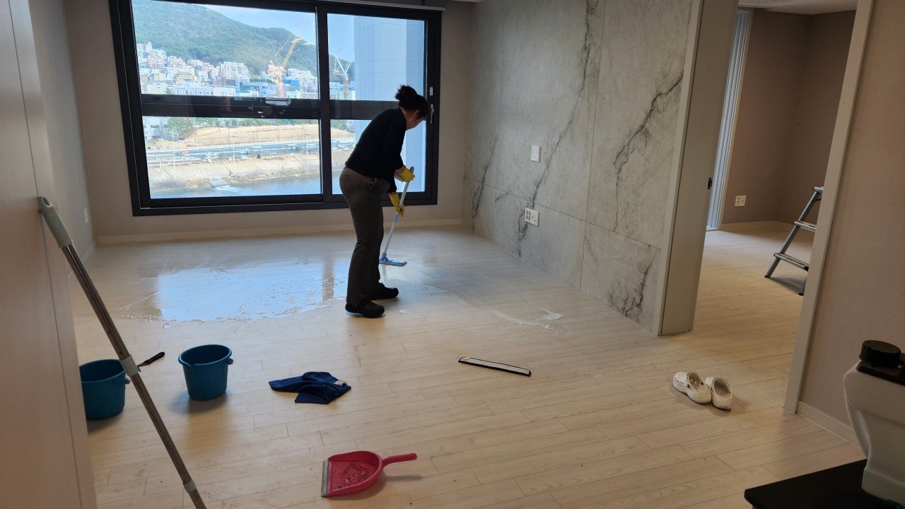 마지막 단계는 바닥 전체 물청소입니다. 이 과정은 실제 입주 후 생활의 편안함과 바로 연결되기 때문에 특히 신경을 많이 씁니다.