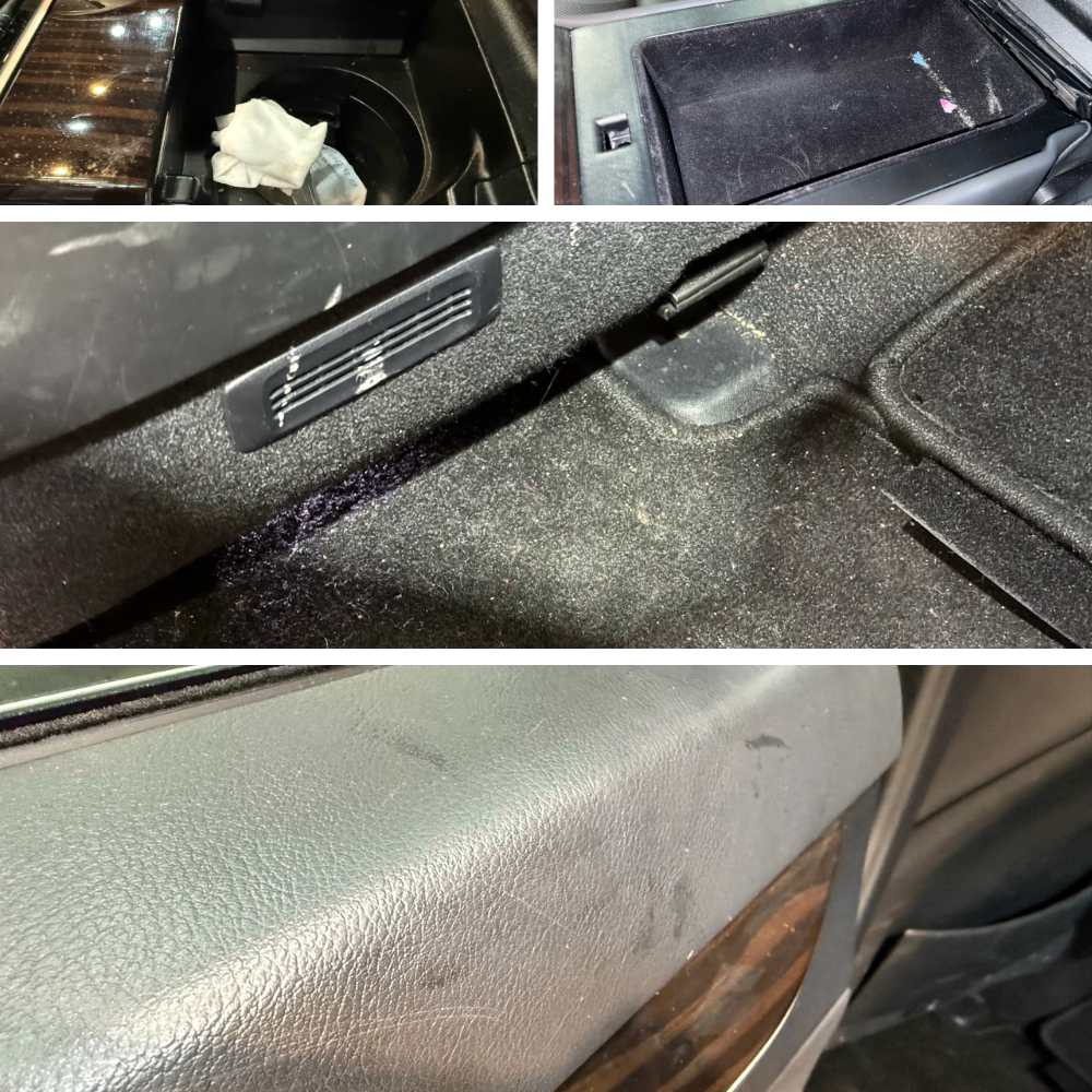 이 구역들을 하나씩 비우고 청소한 다음, 시트 틈과 센터 콘솔, 도어 트림 등 손이 잘 닿지 않는 부분까지 차근차근 정리해 드렸습니다.