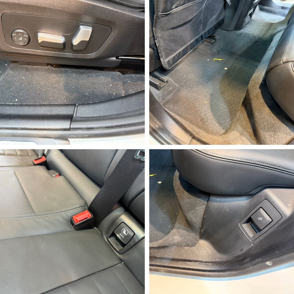 실내는 아이들과 함께 타는 패밀리카답게 군데군데 사용감이 보였는데요. 시트와 바닥 매트 틈, 뒷좌석 발판 주변에는 과자 부스러기와 먼지가 모여 있었고, 도어 트림과 각종 버튼 주변에도 미세한 때가 쌓여 있었습니다.