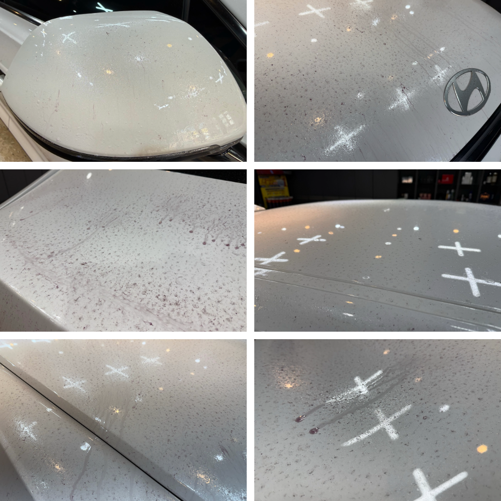 전용 철분 제거제를 도장면에 도포하면, 보이지 않던 오염이 반응하면서 보라색으로 올라오는 모습을 확인할 수 있습니다. 이 과정에서 눈에 잘 띄지 않던 미세 철분과 고착된 오염물들이 함께 분해되고, 이후 진행될 광택 작업이 보다 안정적으로 이루어질 수 있는 기반이 만들어집니다.