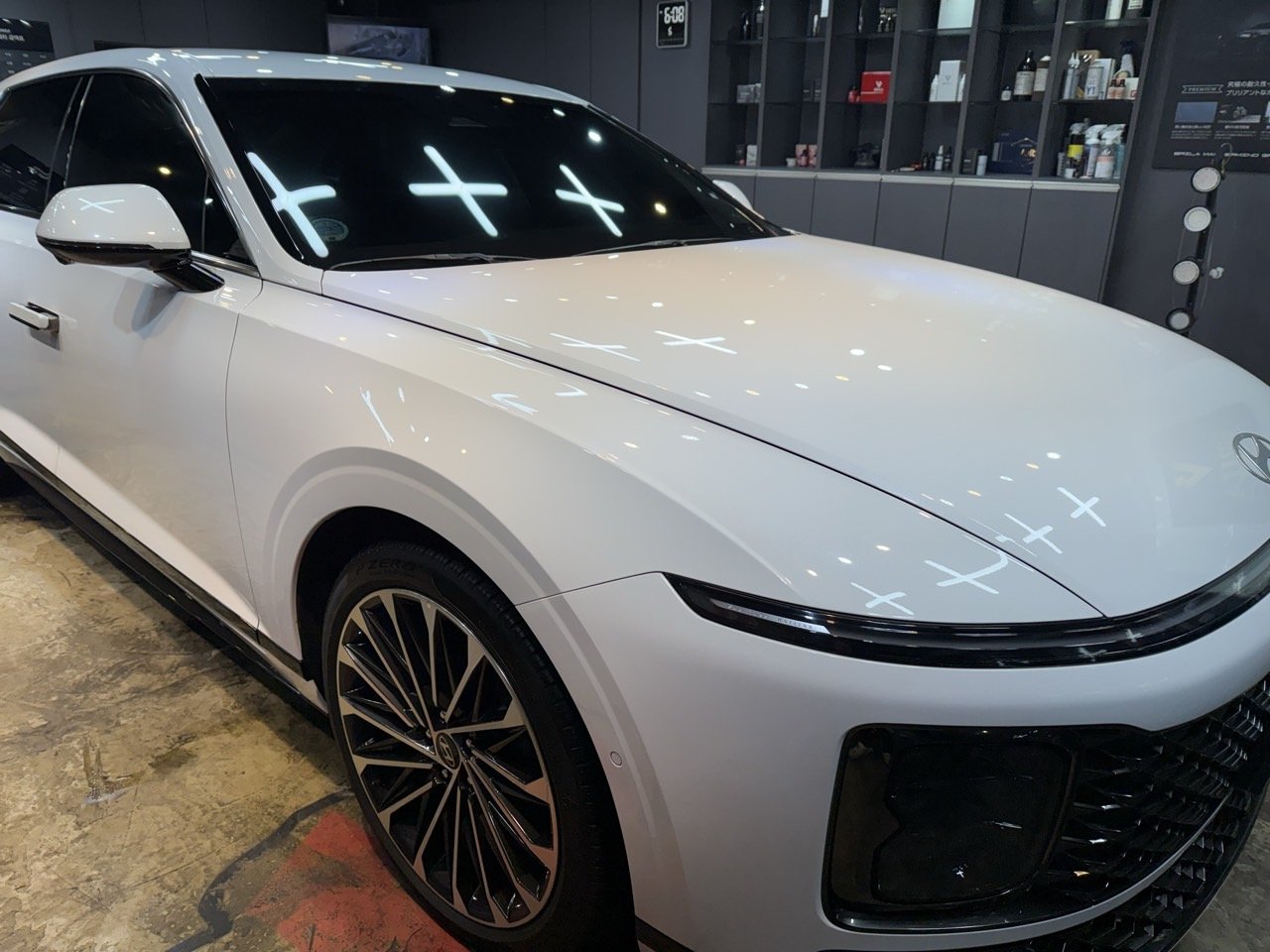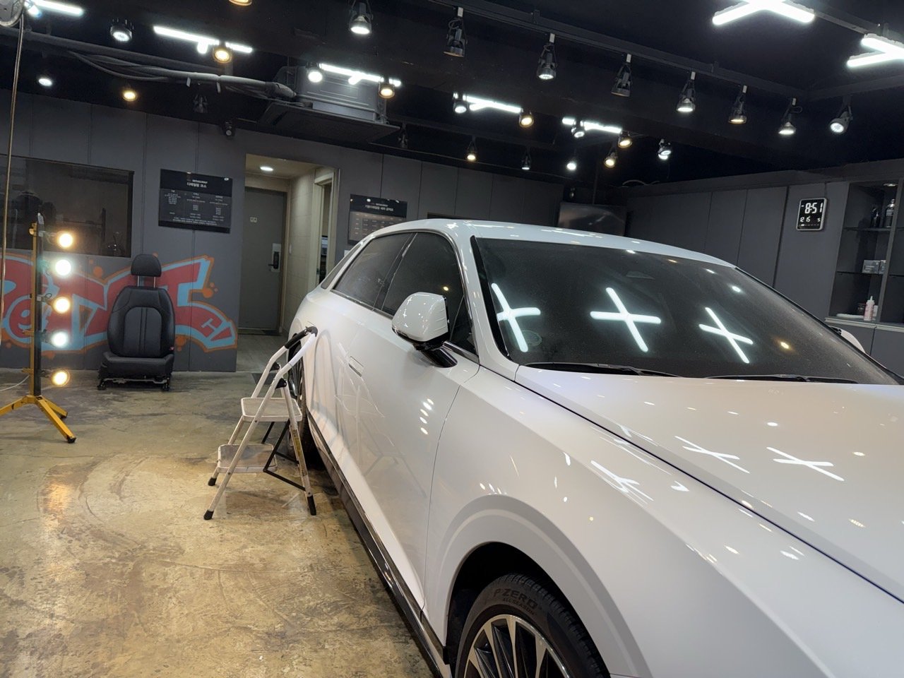 세차와 탈지, 철분 제거까지 마무리한 뒤 물기를 깨끗하게 제거하고, 조명 아래에서 다시 한 번 도장면을 체크했습니다. 이 단계에서 광택 방향과 연마 범위를 구체적으로 설정하게 됩니다.