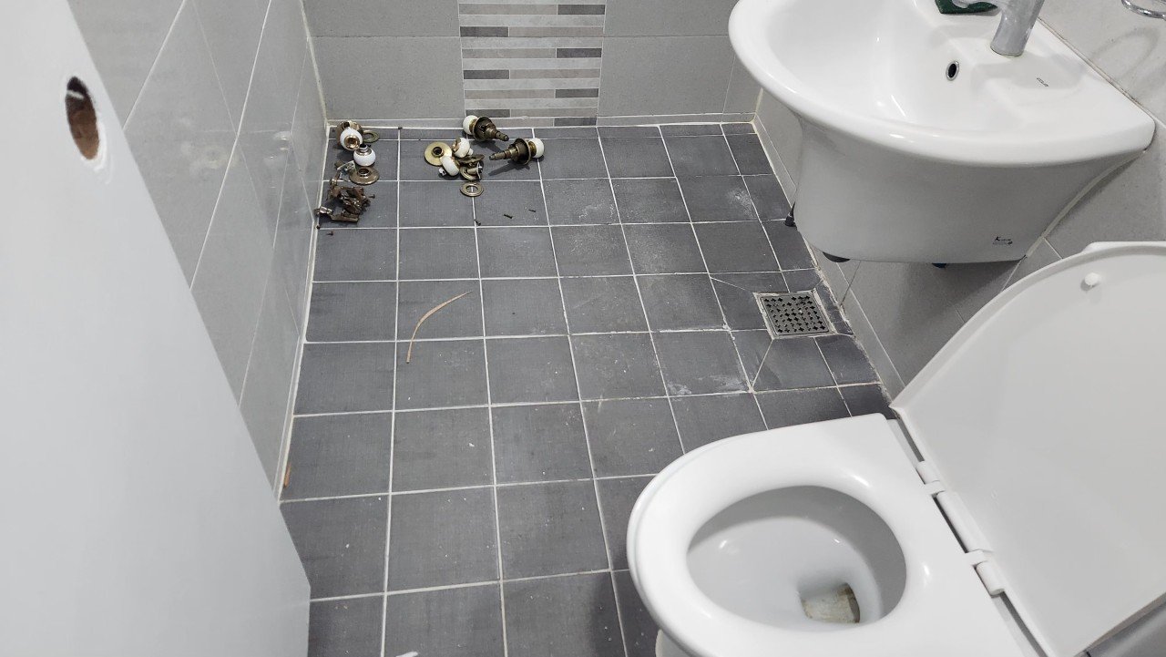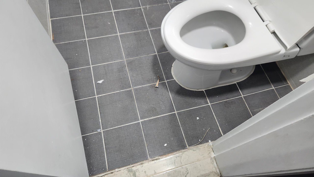 망미주공 아파트 현장에서도 타일 사이사이에 분진이 남아 있었고, 작업 중 튄 자국과 얼룩이 몇 군데 보였습니다. 이 부분은 타일 손상이 가지 않도록 적절한 세정제를 사용해 꼼꼼히 닦아냈습니다.