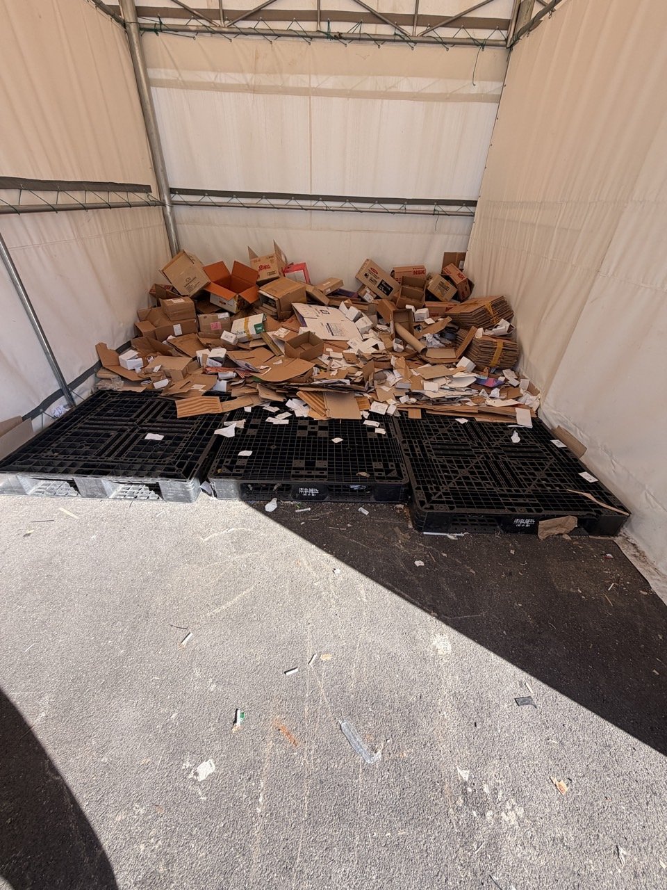 천막 창고 안에는 포장용 비닐, 플라스틱 용기, 각종 포장지와 묶음 형태의 폐지가 산처럼 쌓여 있었고, 더 이상 쌓을 공간이 없어서 정리가 필요하다고 연락을 주신 상황이었습니다.