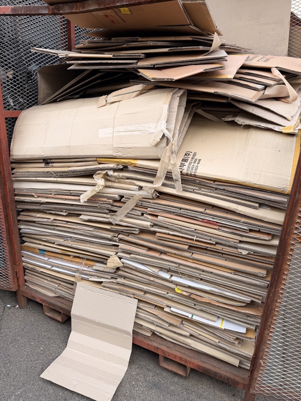 골판지 박스류는 상태에 따라 재활용 자원으로 매입이 가능한 품목이기도 하지만, 오염이 심한 경우에는 일반 사업장폐기물로 처리해야 합니다. 그래서 현장에서는 우선적으로 재활용 가능 여부를 기준으로 분리 작업을 진행했습니다.