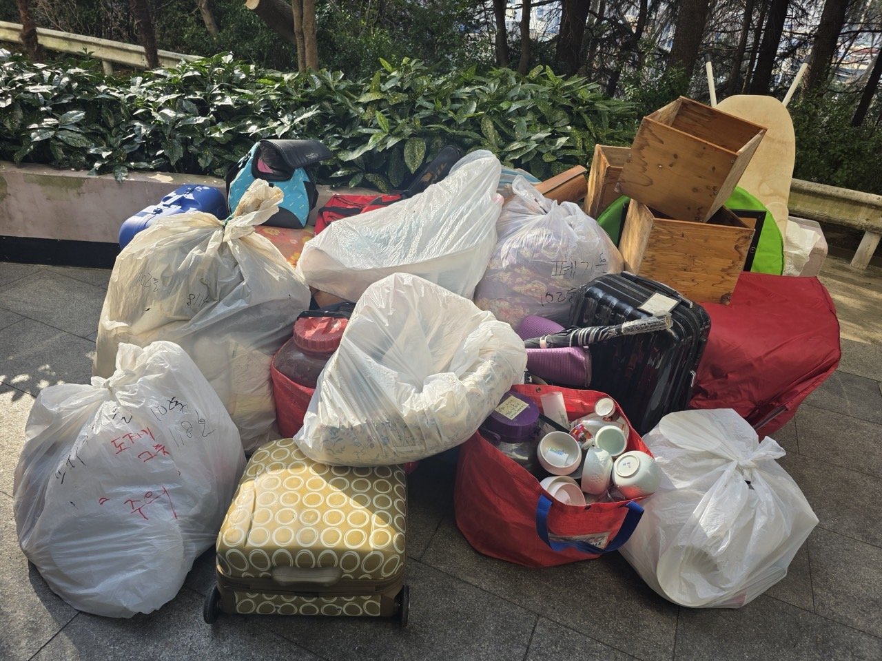 비닐마대, 여행가방, 이불, 각종 생활용품이 통로 한쪽을 가득 채우고 있어서, 새로 입주를 앞두고 계신 분께서 동선 확보를 가장 걱정하고 계셨습니다.