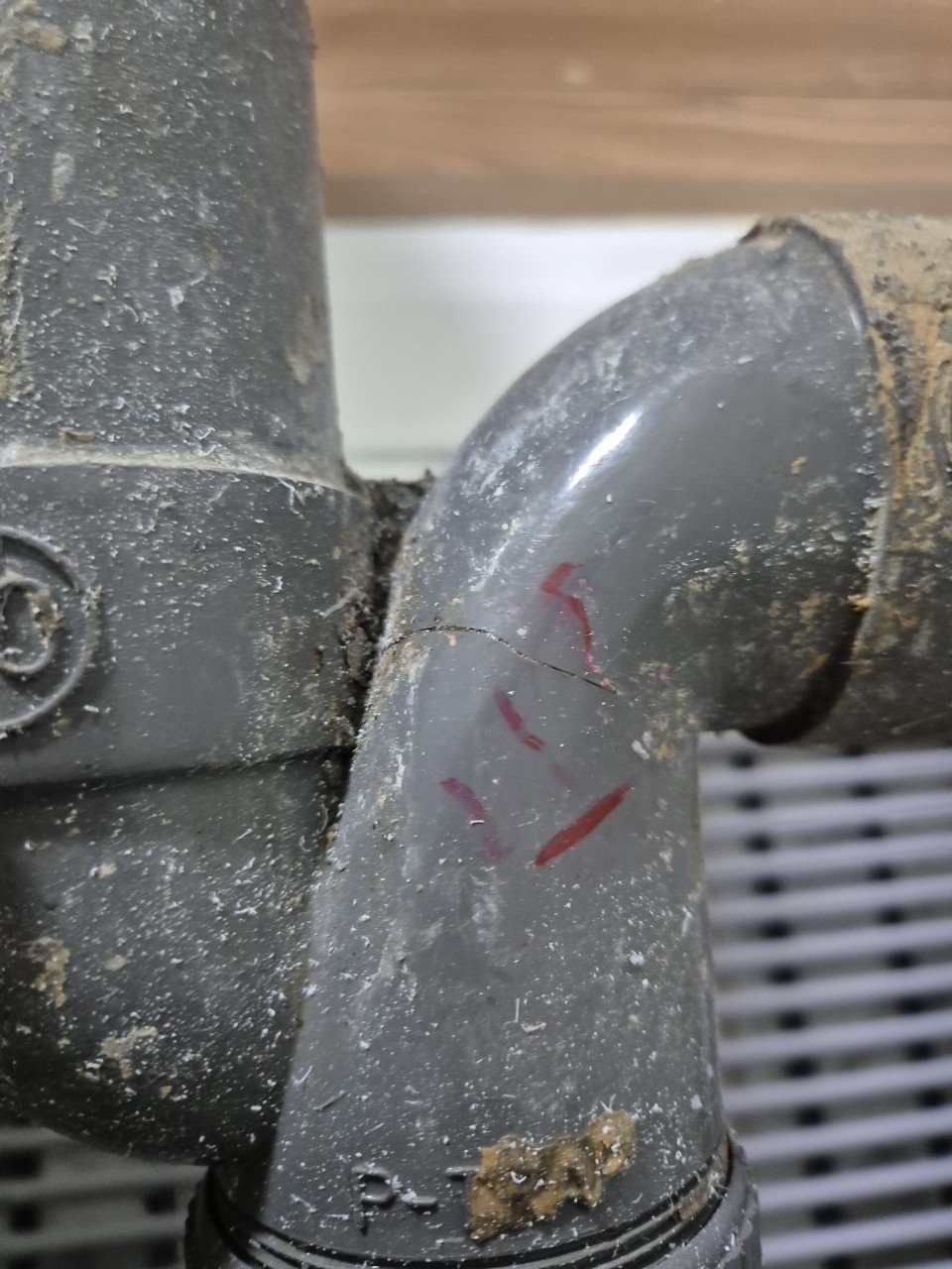 이 현장에서는 화장실 배관 연결 부위 인근에서 이상 징후가 확인되었고, 세밀하게 확인해 본 결과 배관에 미세한 금이 간 부분이 발견되었습니다. 겉으로 물이 확 드러나지 않는 대신, 물 사용 시마다 조금씩 새어 나와 바닥 속으로 스며드는 형태의 누수가 진행되고 있던 상황이었습니다.