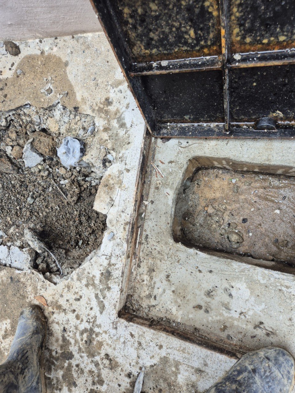의심 구간을 중심으로 바닥 시멘트를 부분 절개하여 관로를 노출했고, 배관이 지나가야 할 자리에 이물질로 꽉 막힌 구간을 확인했습니다. 해당 구간을 신속히 개방하고 막힘을 제거하자, 뒷마당에 고여 있던 물이 한 번에 빠져 내려가며 배수 흐름이 정상화되었습니다.