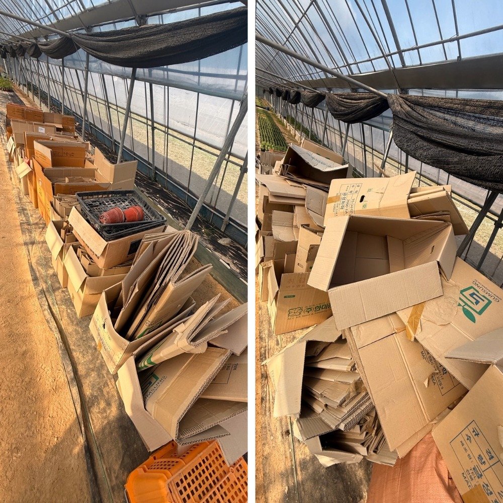 비닐하우스 안에 모아두신 박스를 골판지·혼합지 등으로 나눠 실었습니다. 불필요한 박스가 빠지니 작업 공간이 넓어져 “공간이 확 트였다”며 만족해 하셨어요. 농가 특성상 바닥 먼지가 많아 마지막까지 빗자루로 꼼꼼히 정리했습니다.