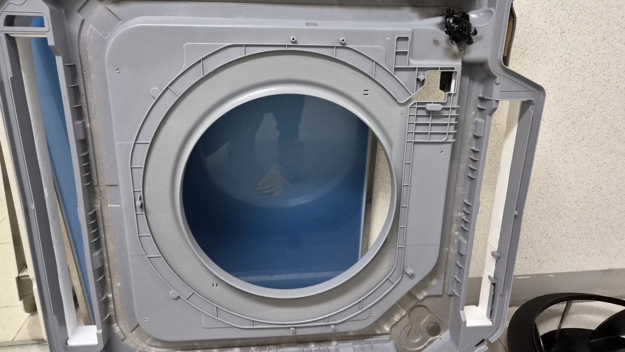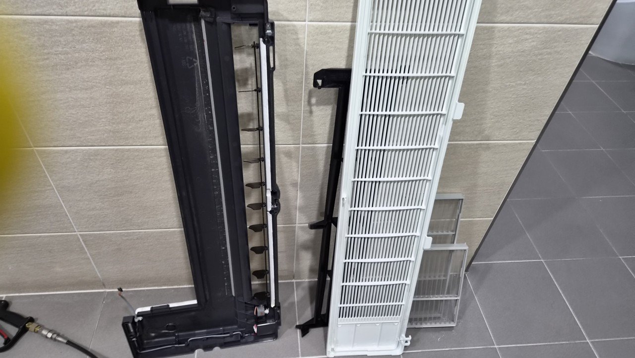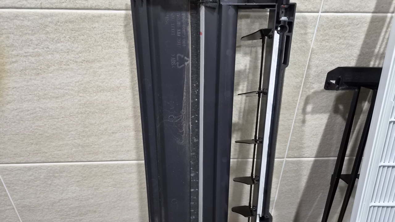 준비를 마친 뒤 풍향 날개가 달린 전면 패널과 커버를 차례대로 분리했습니다. 분해한 부품의 안쪽 면을 확인해 보니 육안으로도 먼지층이 확인될 정도로 오염이 쌓여 있었고, 커버 테두리 부분 역시 손이 잘 닿지 않는 구조라 때가 고르게 남아 있었습니다.
