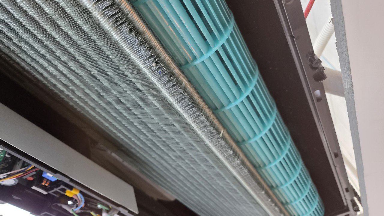 겉에서 보기에는 깔끔해 보이는 천장형 시스템 냉난방기였지만, 점검을 위해 패널을 열어보니 내부 곳곳에 먼지와 오염이 눈에 띄었습니다. 특히 풍향 조절 날개 안쪽, 전면 커버 테두리, 열교환기 주변으로 미세먼지가 고르게 쌓여 있는 상태였습니다.