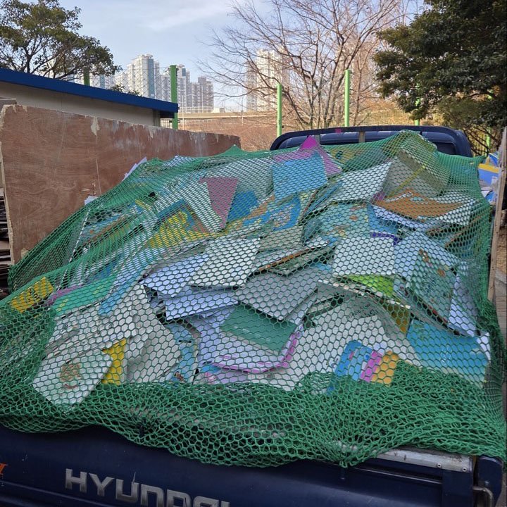 모든 적재를 마친 후에는 망을 꼼꼼하게 덮어 주행 중 낙하가 발생하지 않도록 다시 한 번 확인했습니다. 눈에 보이는 큰 박스들뿐만 아니라 작업 과정에서 바닥에 떨어진 종이 조각이나 잔해도 마지막까지 살펴보고 정리해 학교 측에서 바로 공간을 사용할 수 있도록 마무리했습니다.
