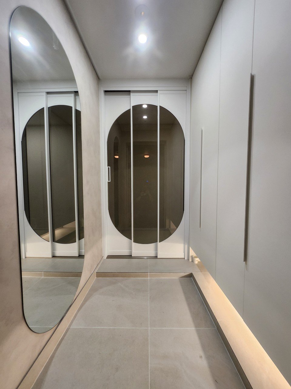슬라이딩 중문은 유리 라인을 활용해 답답함 없이 실내와 현관을 연결하도록 디자인했습니다. 복도 끝까지 시선이 이어지기 때문에 실제 거리감보다 더 여유로운 느낌을 줍니다.