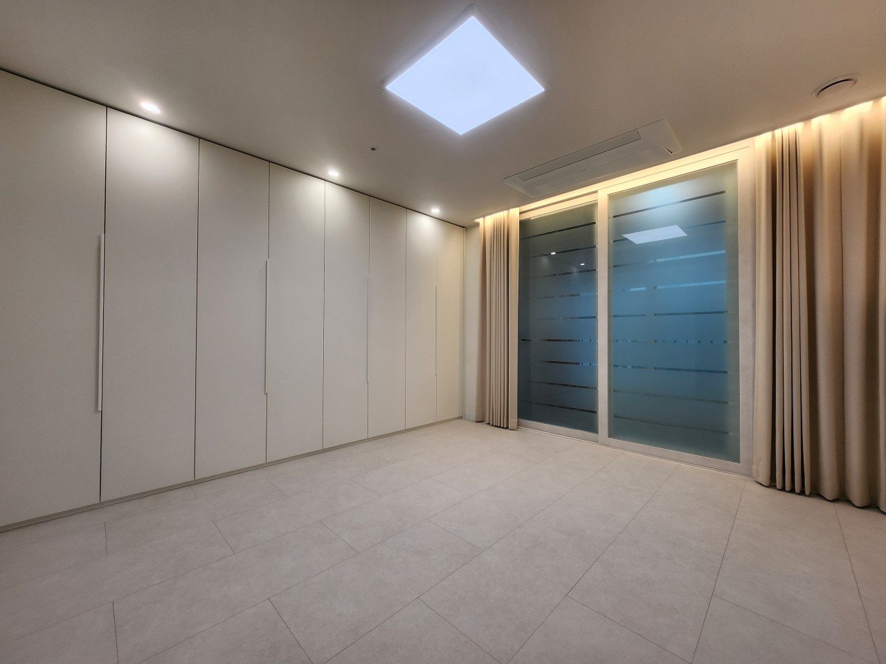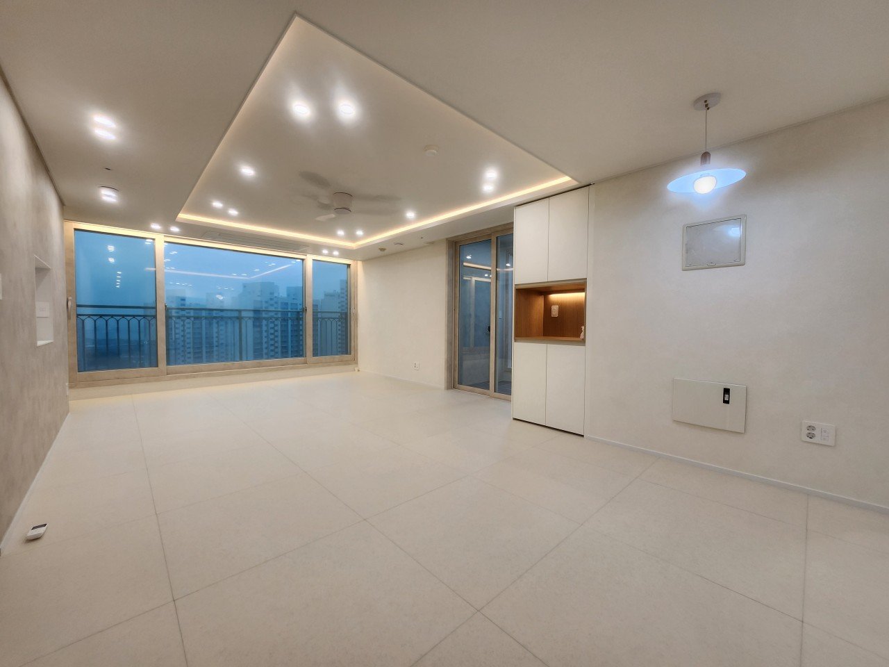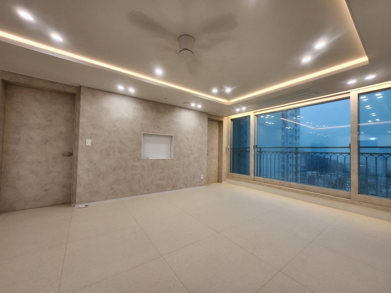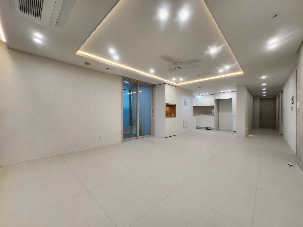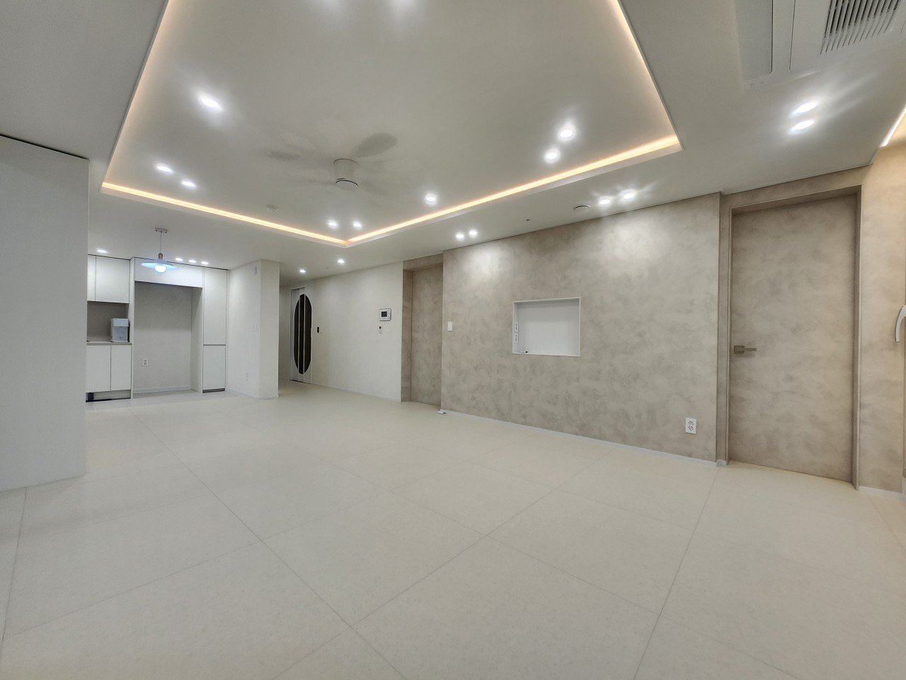 바닥은 밝은 컬러의 대형 타일 느낌으로 시공해 시선이 시원하게 펼쳐지도록 했고, 덕분에 실제 평수보다 넓게 느껴지는 효과가 생겼습니다. 천장은 중앙 라인을 살려 간접조명이 부드럽게 번지도록 설계해, 눈에 직접적인 자극 없이 은은하게 공간을 밝혀줍니다.