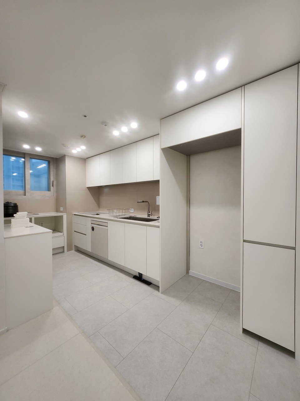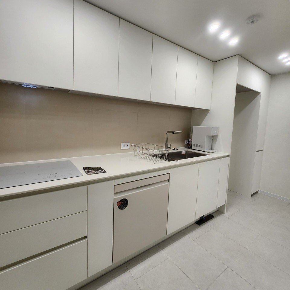 상부장과 하부장은 화이트 톤으로 길게 뻗어 나가도록 설계해, 주방 벽면 전체가 하나의 라인처럼 보이게 만들었습니다. 덕분에 작게 나뉜 느낌 없이 깔끔하게 정돈된 인상을 주고, 자잘한 물건이 있어도 상대적으로 덜 어수선해 보입니다.