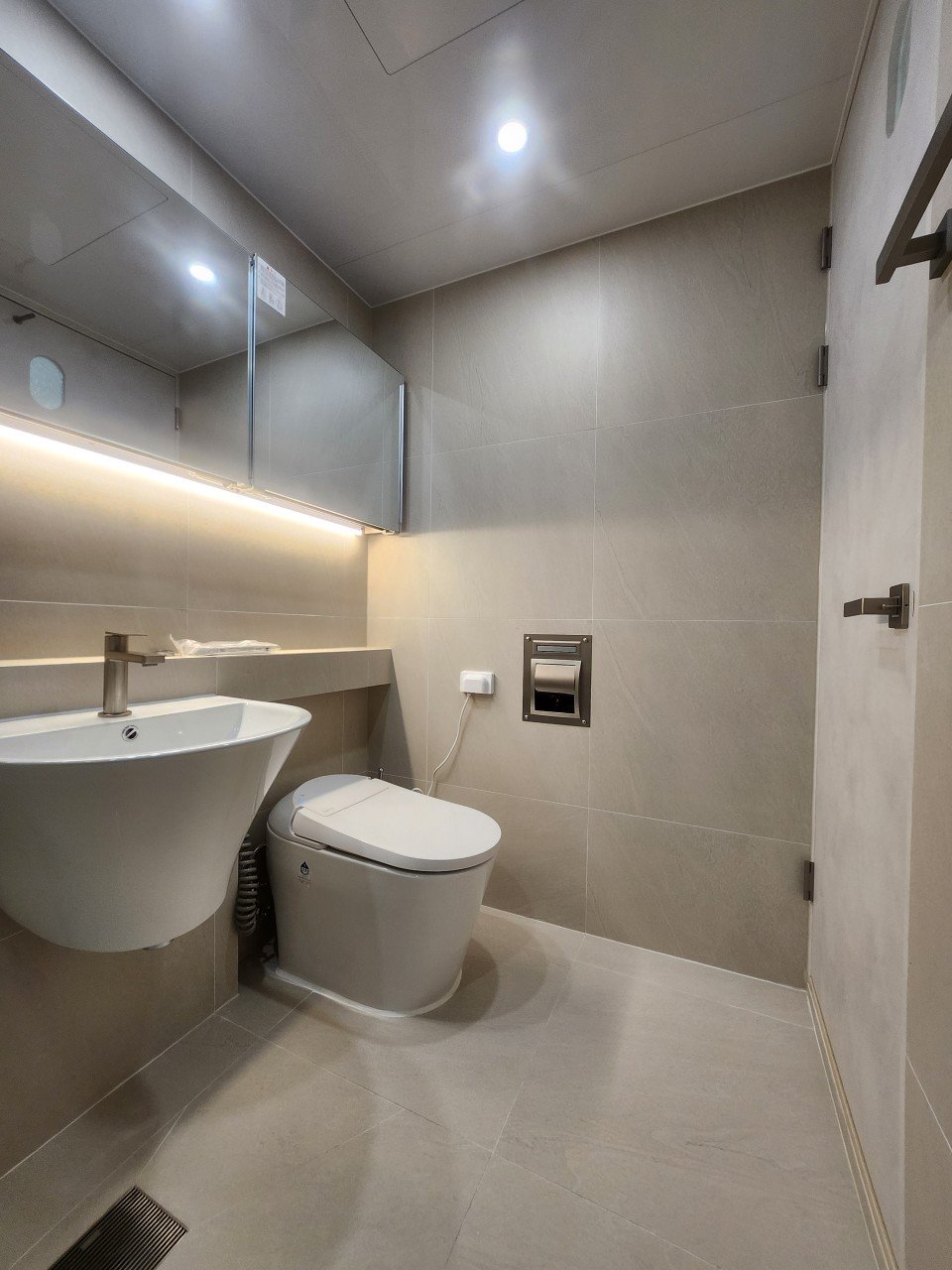 벽과 바닥은 톤 차이를 크게 두지 않고 자연스럽게 이어지도록 해, 시선이 끊기지 않는 편안한 분위기를 만들었습니다. 거울장 내부 조명은 세면대 주변을 충분히 밝혀주어 아침, 저녁 세안과 화장 시에도 사용감이 좋습니다.