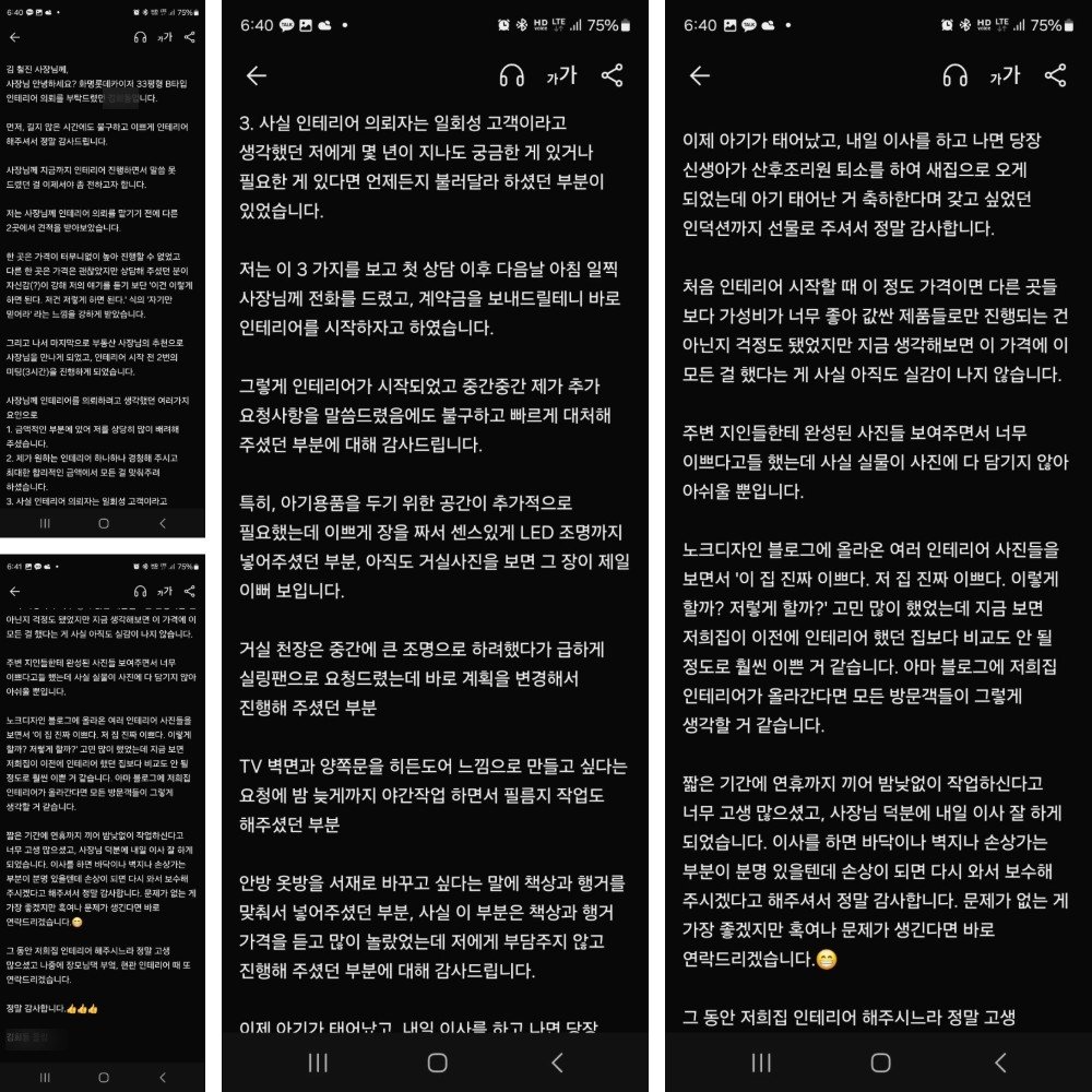 공사가 끝난 후 고객님께서 직접 긴 후기를 남겨주셨습니다. 예산과 견적에 대한 설명부터 상담 과정, 공사 중간에 발생한 추가 요청까지 세세하게 언급해 주셨는데요.