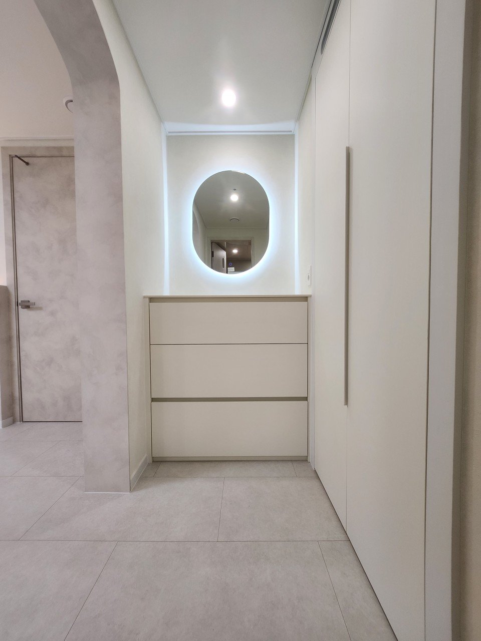 이번 현관의 포인트는 라운드 조명거울입니다. 라운드 프레임에서 뿜어져 나오는 부드러운 빛 덕분에, 집에 들어서는 순간 전체 분위기가 자연스럽게 환해집니다. 단순히 외출 전 체크 용도뿐 아니라, 현관 자체를 하나의 작은 포인트 공간으로 완성해주는 요소가 되었습니다.