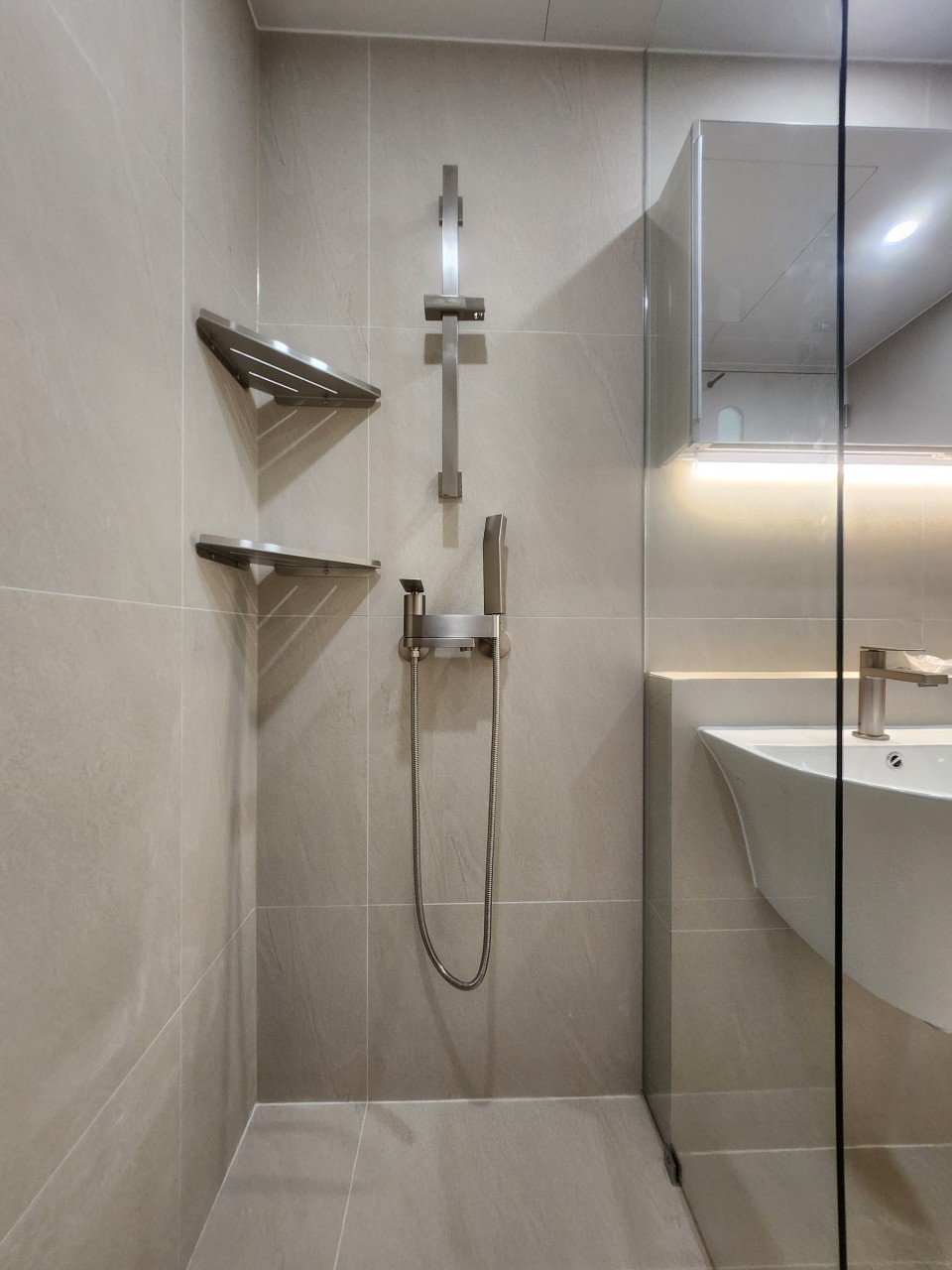 샤워 공간은 선반과 수전 위치를 세밀하게 맞춰 실사용성이 떨어지지 않도록 했습니다. 샴푸와 바디워시를 올려두는 작은 선반 하나도 물길과 동선을 고려해 배치해, 정리된 느낌과 관리 편의성을 동시에 챙겼습니다.